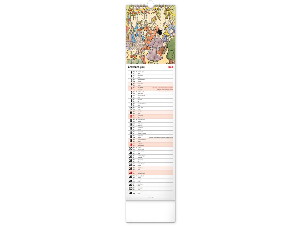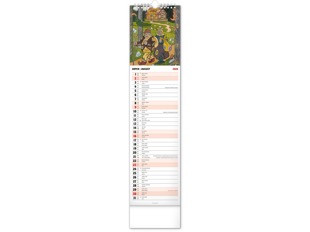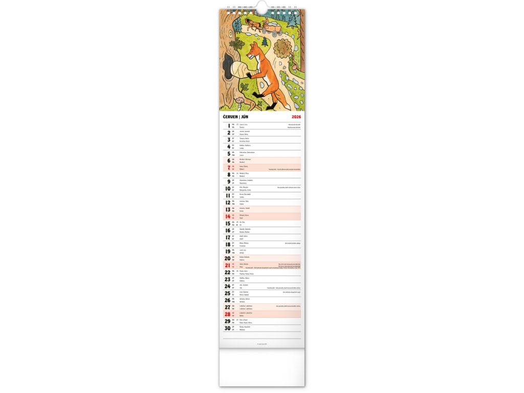 Nástěnný kalendář s ilustracemi Josefa Lady a jeho pohádkovými motivy je vyhotoven v oblíbeném úzkém formátu, který osvěží každý interiér. V kalendáři je rovnocenně zahrnuta čeština a slovenština, ilustrace doplňují česká a slovenská jména, svátky, památné dny a měsíční fáze. Každý den má prostor pro poznámky, víkendové dny jsou barevně odlišené od pracovních.Doplňkové parametry