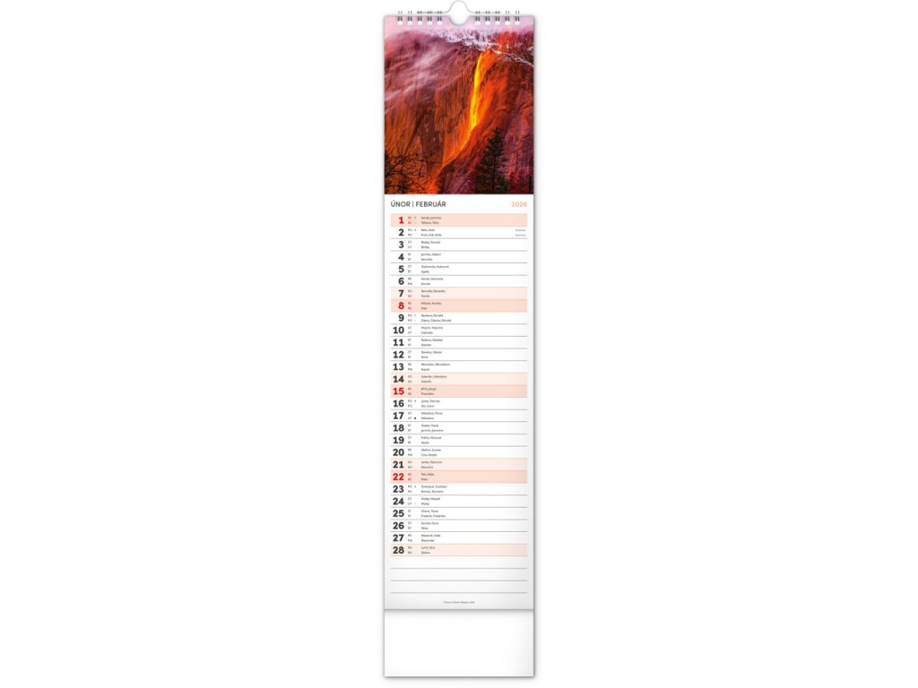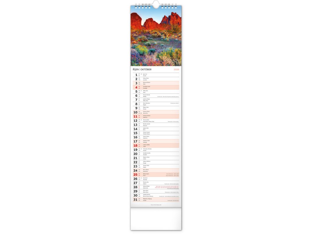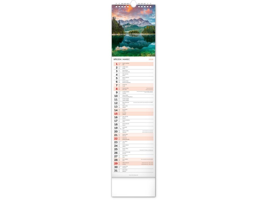Udělejte si radost pohledem na fotografie malebné krajiny v praktickém úzkém formátu česko-slovenského nástěnného kalendáře. Kalendář obsahuje česká a slovenská jména, svátky, památné dny i měsíční fáze. V každém jednotlivém dni je prostor pro poznámky.Doplňkové parametry