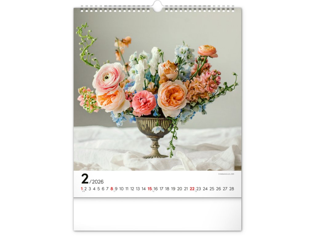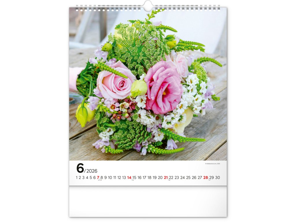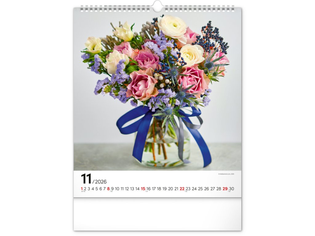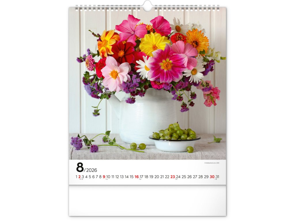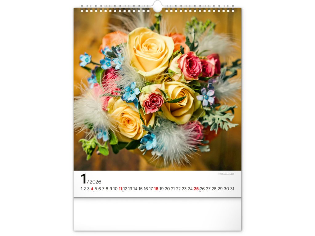 Fotografie pestrobarevných květin a originálních vazeb v nástěnném kalendáři na výšku. Fotografie doplňuje univerzální kalendárium na bílém pozadí.Doplňkové parametry