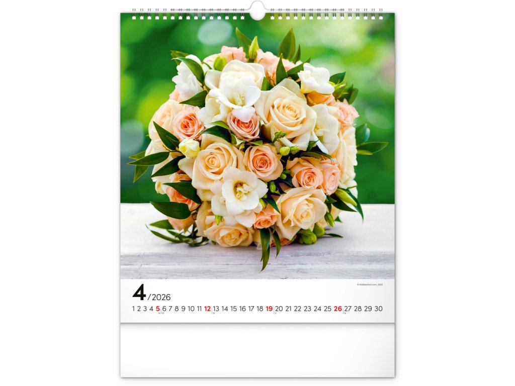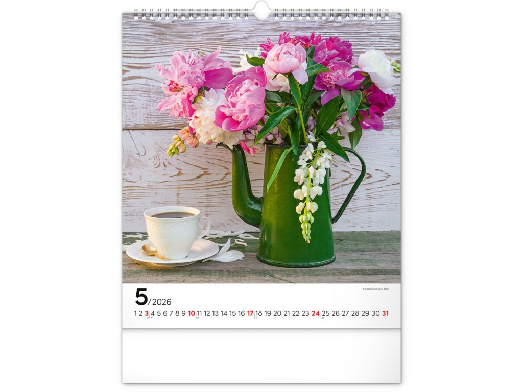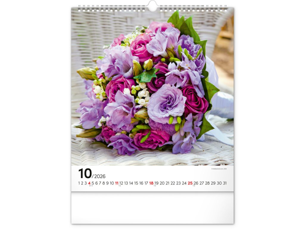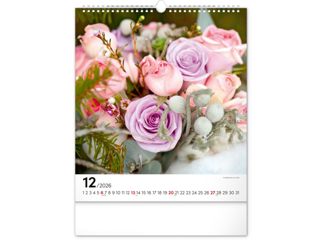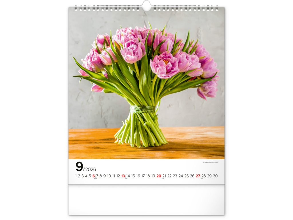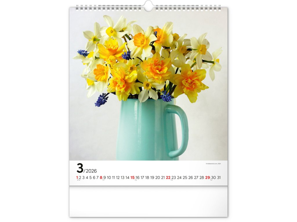 Fotografie pestrobarevných květin a originálních vazeb v nástěnném kalendáři na výšku. Fotografie doplňuje univerzální kalendárium na bílém pozadí.Doplňkové parametry