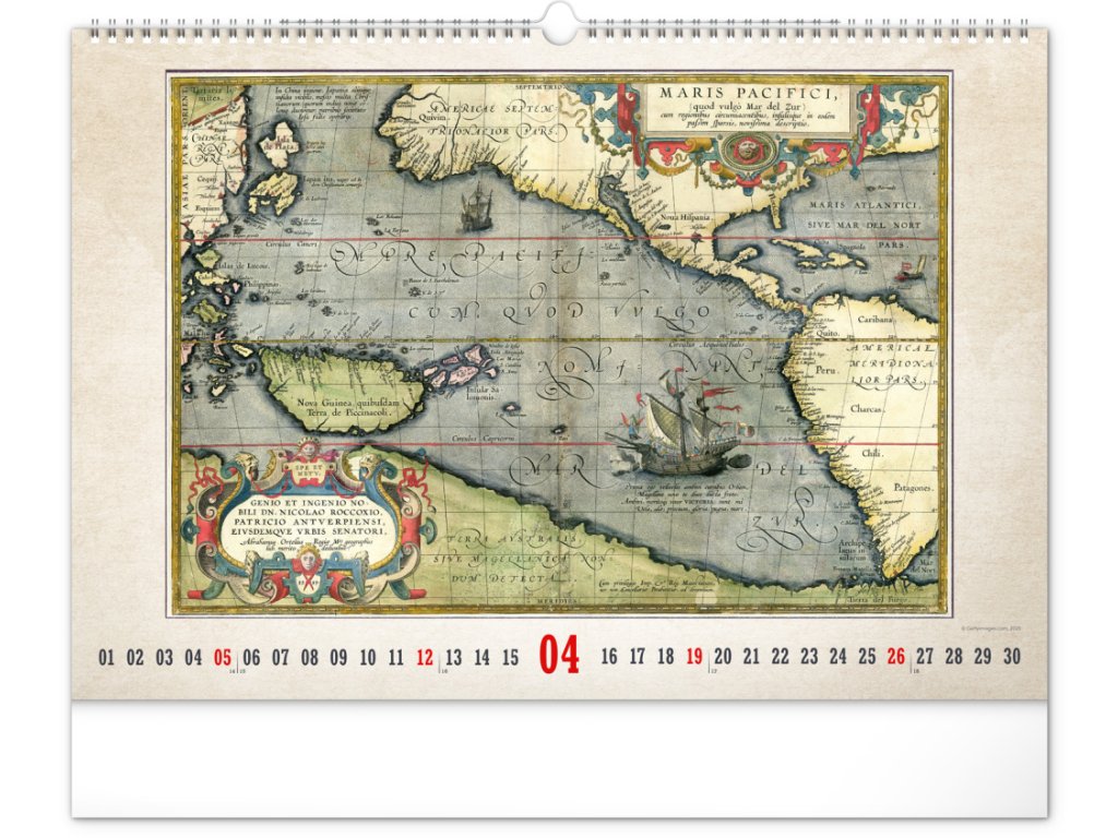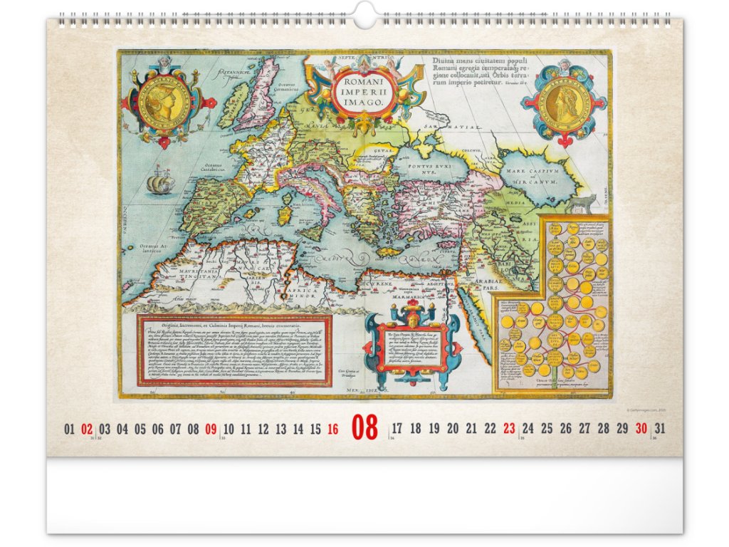 Kalendář pro všechny znalce ručně vytvořených map z dávných dob. Detailní kresby s estetickou hodnotou ale potěší i milovníky užitého umění. Jednoduché kalendárium na bílém pozadí.Doplňkové parametry