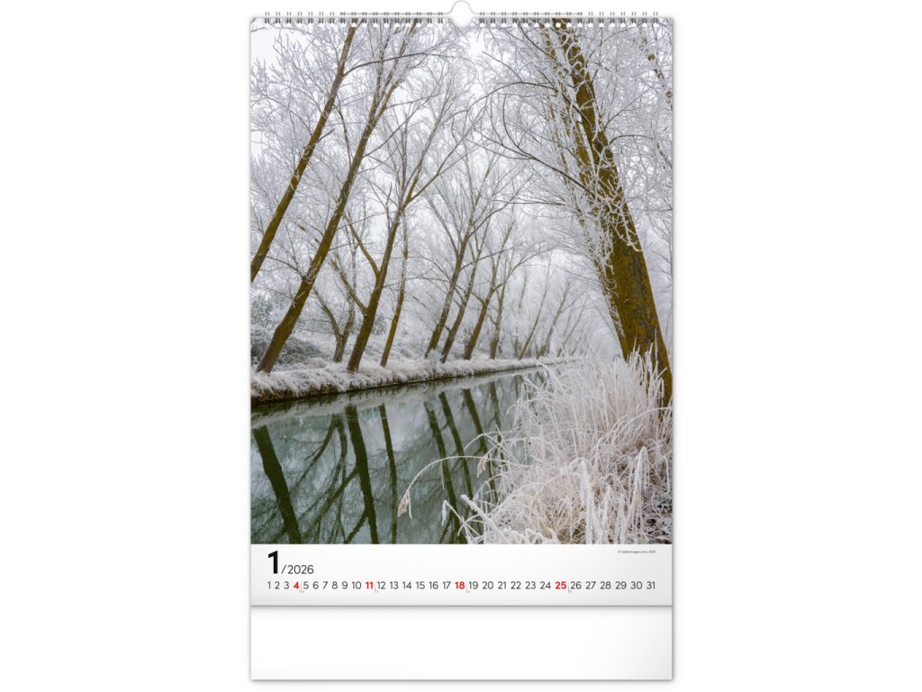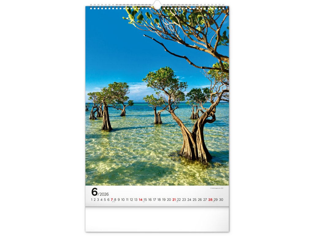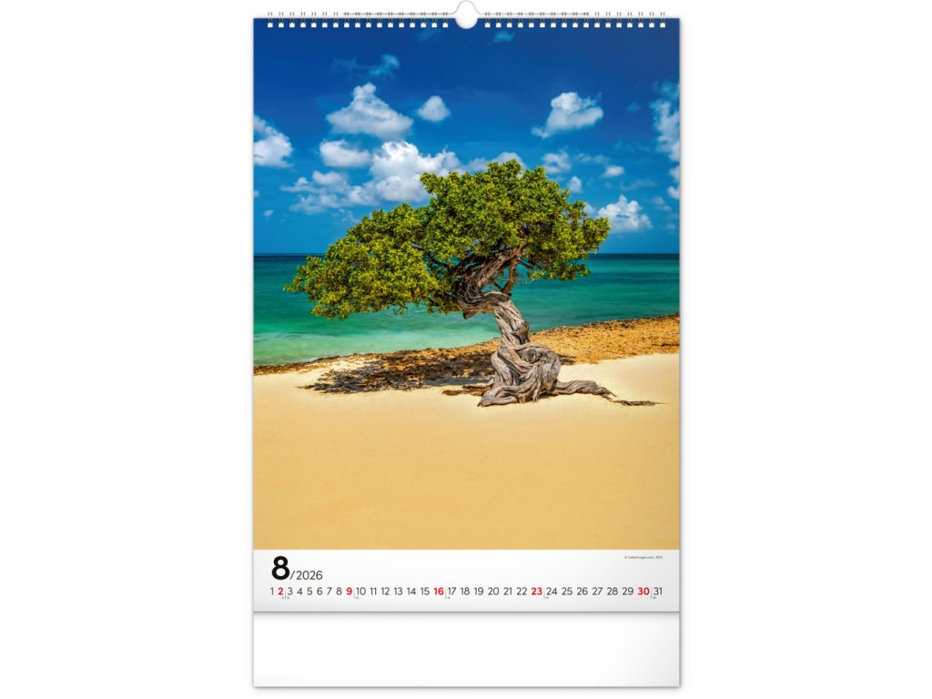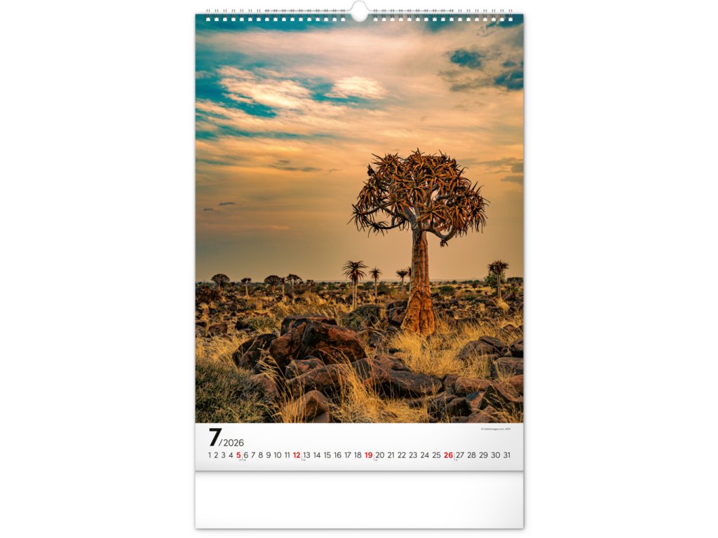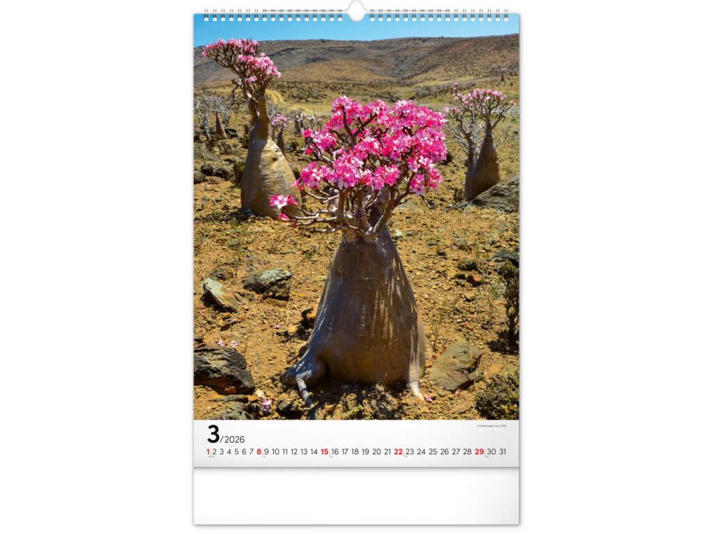 Nástěnný kalendář s fotografiemi pestrých scenérií s dominantami majestátních stromů z celého světa. Fotografie jsou doplněny univerzálním kalendáriem na bílém pozadí.Doplňkové parametry