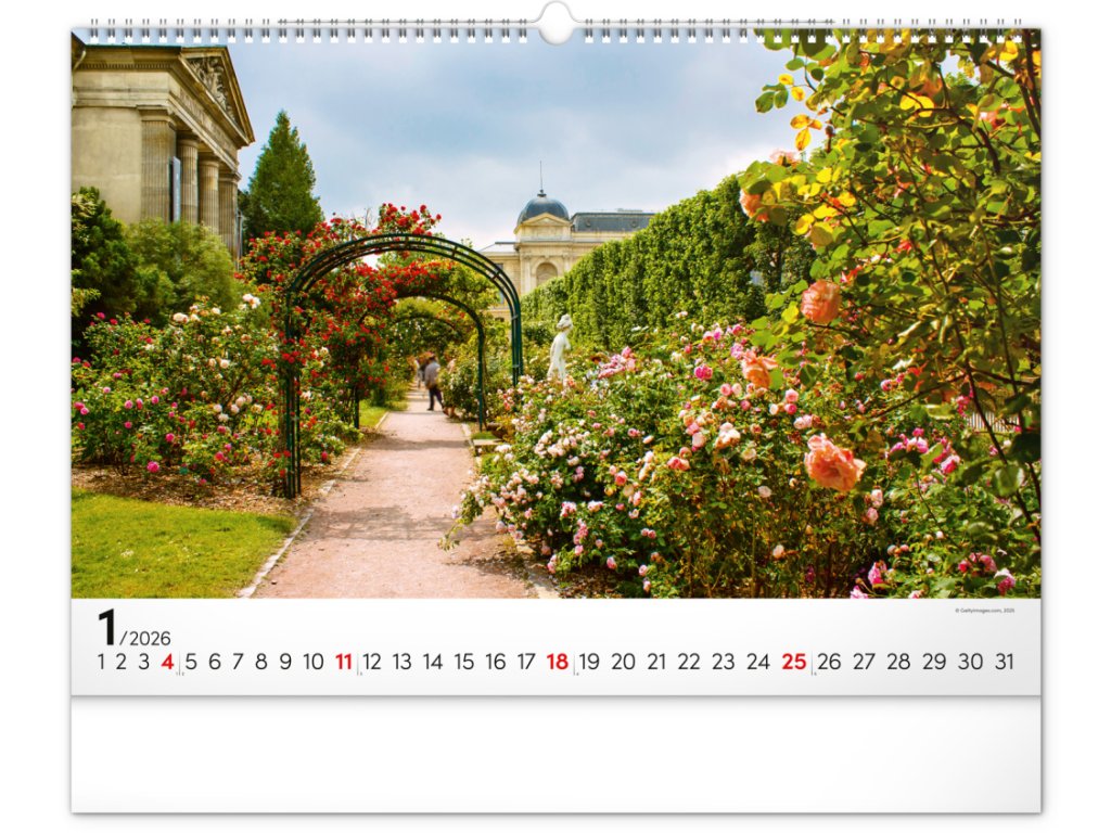 Dvanáct snímků zachycujících pomíjivou krásu květin v zahradách. Vy si však budete pohledu na nádherné barevné zahrady užívat po celý rok. Zahrady, oázy klidu a relaxace v nástěnném kalendáři doplňuje univerzální kalendárium se zvýrazněnými nedělemi na černém pozadí.Doplňkové parametry