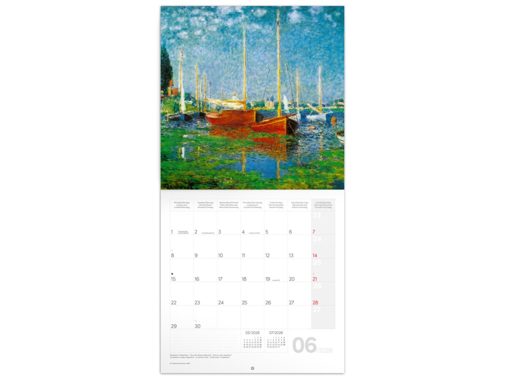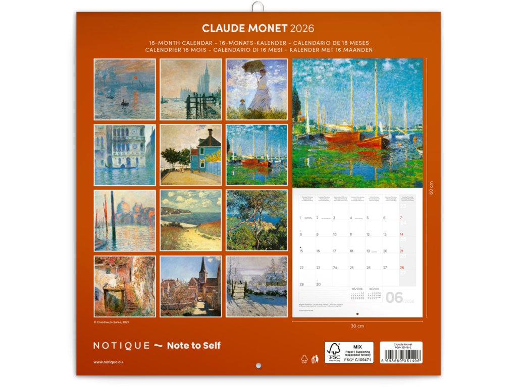Udělejte ze svého bytu uměleckou galerii díky našemu kalendáři. Poznámkový kalendář s reprodukcemi nejznámějších obrazů impresionistického malíře Clauda Moneta doplňuje šestijazyčné kalendárium s prostorem pro vaše plány a poznámky.Doplňkové parametry