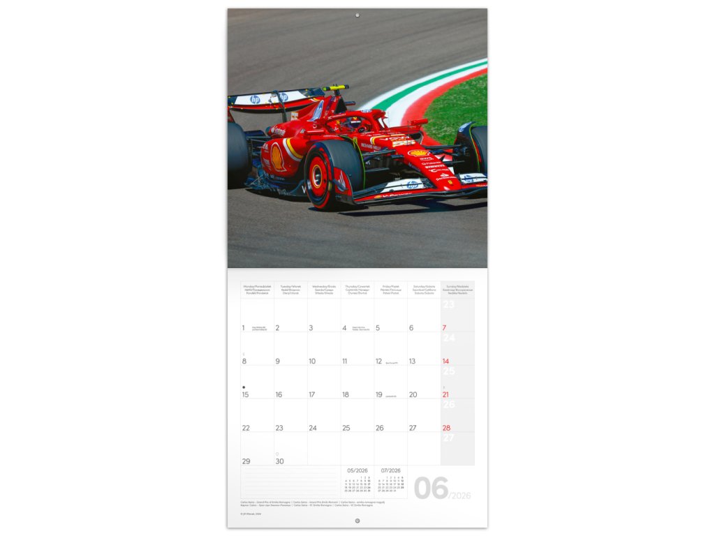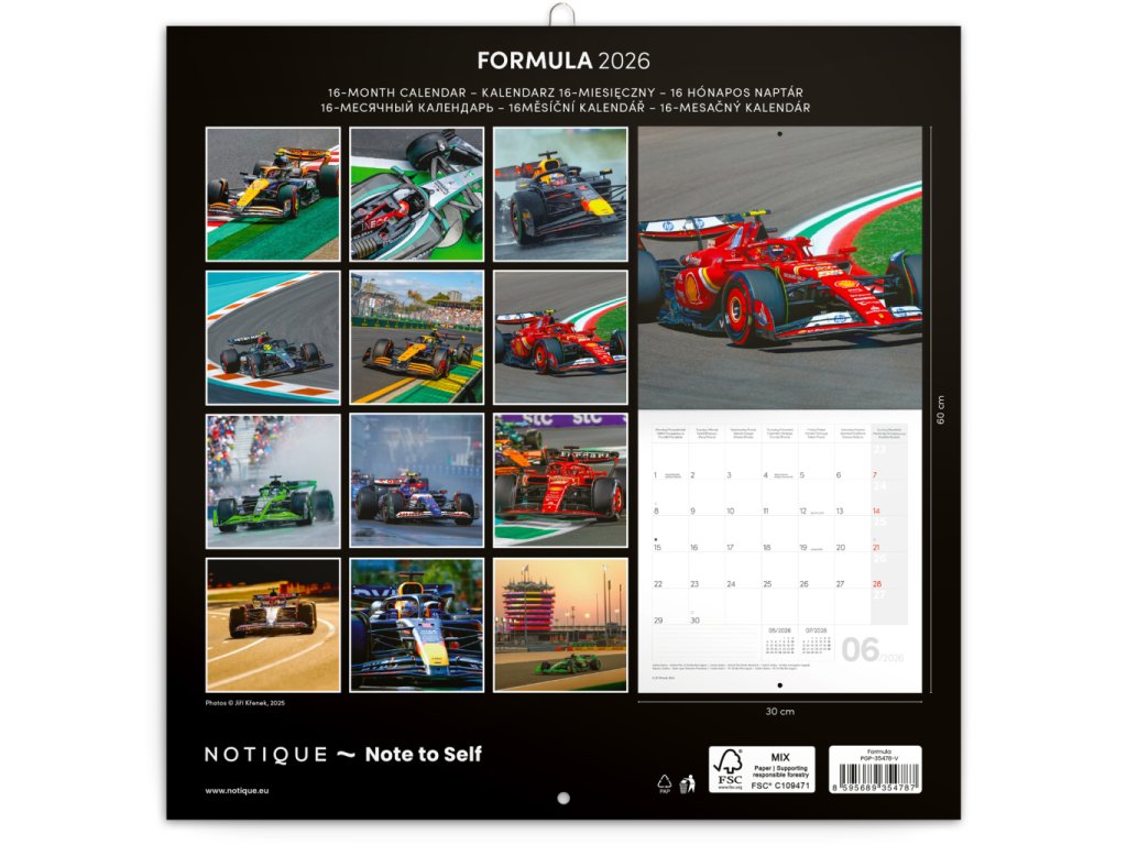 Atraktivní fotografie z prostředí adrenalinového světa Formule 1, zachycené objektivem Jiřího Křenka. V kalendáři kromě fotek najdete přehledné kalendárium od září 2025 do prosince 2026 v šesti jazycích, měsíční fáze, důležité svátky a prostor pro poznámky na každý den.Doplňkové parametry