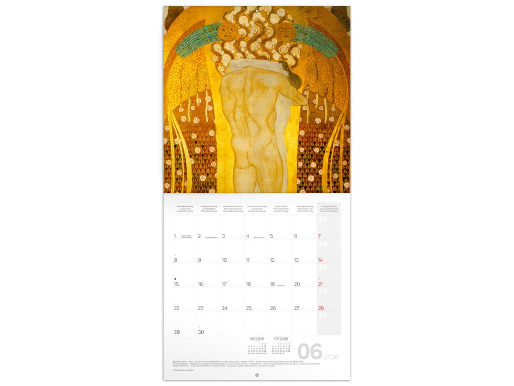 Obrazy populárního secesního malíře Gustava Klimta na stránkách poznámkového kalendáře. Ten obsahuje přehledné kalendárium od září 2025 do prosince 2026 v šesti jazycích, měsíční fáze, důležité svátky a prostor pro poznámky na každý den.Doplňkové parametry