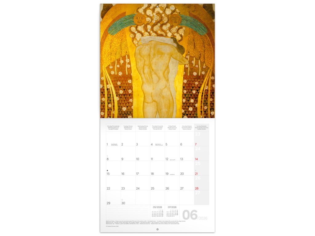 Obrazy populárního secesního malíře Gustava Klimta na stránkách poznámkového kalendáře. Ten obsahuje přehledné kalendárium od září 2025 do prosince 2026 v šesti jazycích, měsíční fáze, důležité svátky a prostor pro poznámky na každý den.Doplňkové parametry