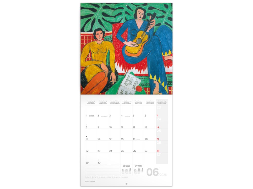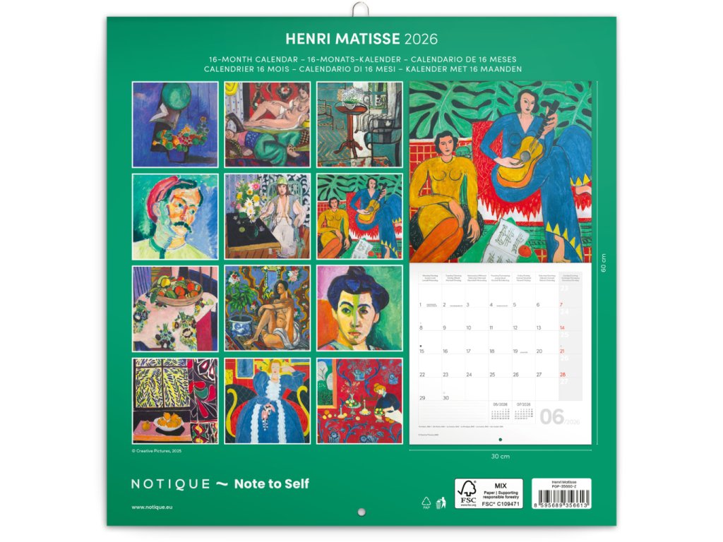 Objevte svět barev a tvarů jednoho z nejvýznamnějších umělců 20. století. Díla Henriho Matisse na stránkách poznámkového kalendáře potěší každého milovníka umění. Obsahuje přehledné kalendárium od září 2025 do prosince 2026 v šesti jazycích, měsíční fáze, důležité svátky a prostor pro poznámky na každý den.Doplňkové parametry