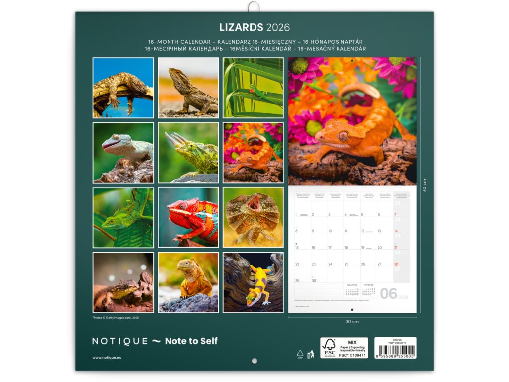 Každý měsíc budete obdivovat jiného zástupce plazí říše, který jako by pamatoval dinosaury. V kalendáři kromě fotek najdete přehledné kalendárium od září 2025 do prosince 2026 v šesti jazycích, měsíční fáze, důležité svátky a prostor pro poznámky na každý den.Doplňkové parametry