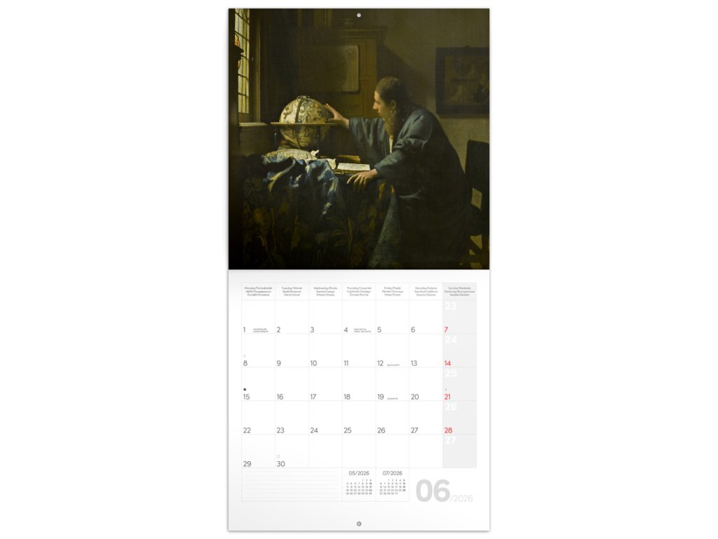 Vstupte do světa mistrovských realistických zobrazení každodenního života malíře Johannese Vermeera. Jeho díla, plná jemné atmosféry a světelných efektů, vás zavedou do zlaté éry holandského baroka. Poznámkový kalendář obsahuje přehledné kalendárium od září 2025 do prosince 2026 v šesti jazycích, měsíční fáze, důležité svátky a prostor pro poznámky na každý den.Doplňkové parametry