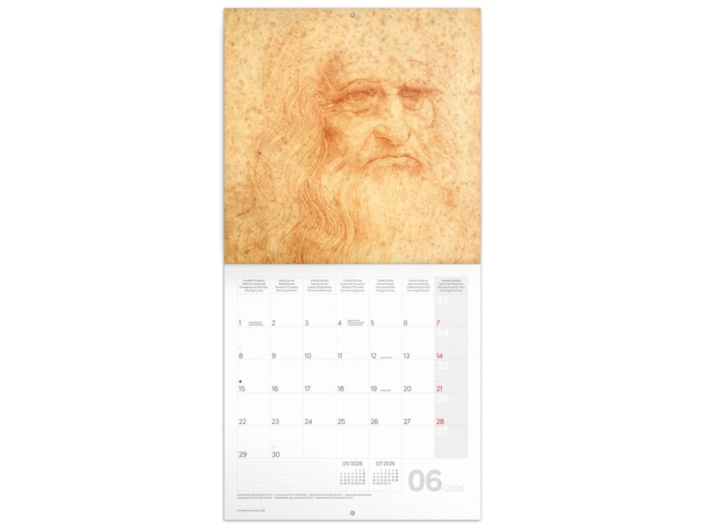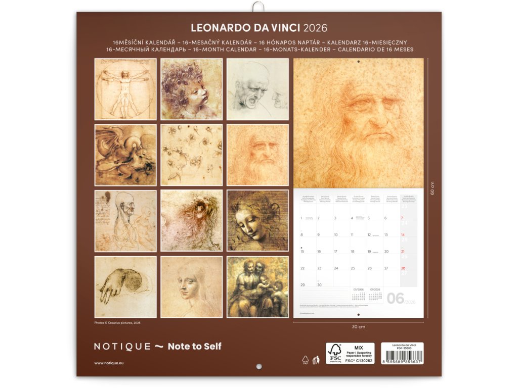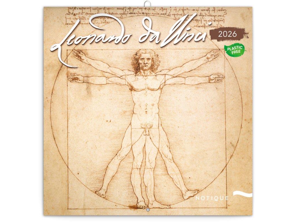 Dvanáct obrazů Leonarda da Vinciho v praktickém poznámkovém kalendáři. Kalendář obsahuje přehledné kalendárium od září 2025 do prosince 2026 v osmi jazycích, měsíční fáze, důležité svátky a prostor pro poznámky na každý den. Kalendář je součástí kolekce Plastic Free, je zabalený v obálce z recyklovaného papíru a vytištěný na recyklovaném strukturovaném papíře s vysokou gramáží.Doplňkové parametry