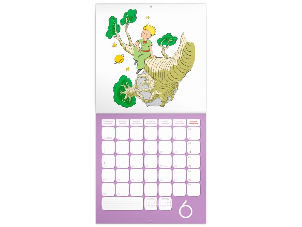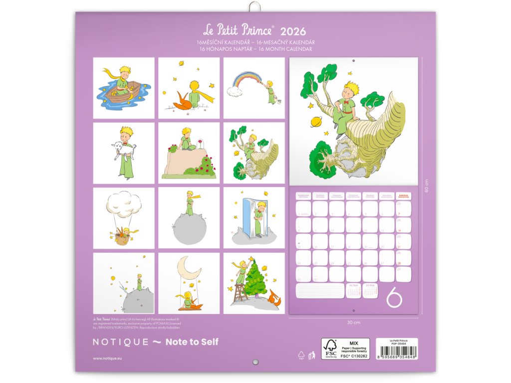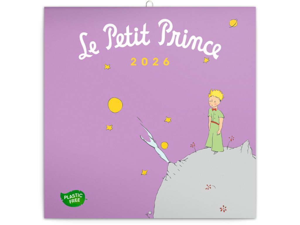 „To důležité vidíme srdcem!“ Příběh o Malém princi nás učí vidět ve věcech a lidech víc než jen povrch a zajímat se o svět kolem i uvnitř nás. Ilustrace ze známé knížky francouzského spisovatele a ilustrátora Antoina de Saint-Exupéryho doplňuje přehledné kalendárium od září 2025 do prosince 2026 ve čtyřech jazycích, měsíční fáze, důležité svátky a prostor pro poznámky na každý den. Kalendář je součástí kolekce Plastic Free, je zabalený v obálce z recyklovaného papíru a vytištěný na recyklovaném strukturovaném papíře s vysokou gramáží.Doplňkové parametry