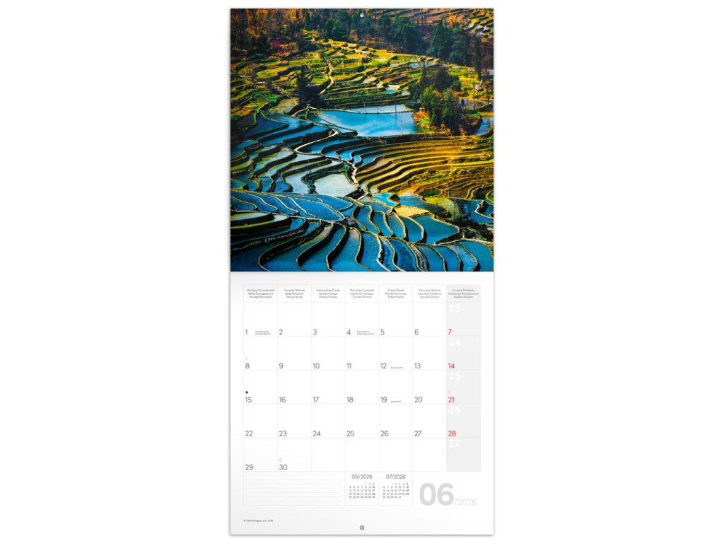 Dvanáct překrásných krajinných fotografií z různých koutů světa. Kalendář obsahuje přehledné kalendárium od září 2025 do prosince 2026v šesti jazycích, měsíční fáze, důležité svátky a prostor pro poznámky na každý den.Doplňkové parametry