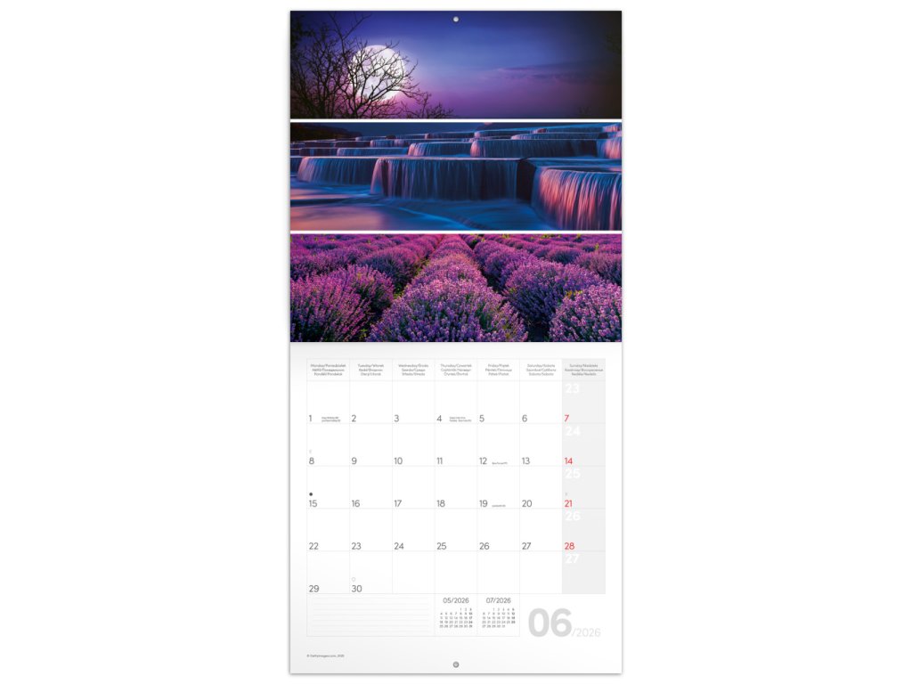 Kalendář s nádhernými fotografiemi rozmanitých prostředí a rostlin, které vás přenesou do sytě barevných světů. Obsahuje šestijazyčné kalendárium, měsíční fáze, důležité svátky a prostor pro vaše poznámky a plány.Doplňkové parametry
