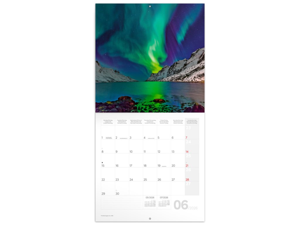 Poznámkový kalendář s dvanácti fotografiemi, na kterých se podařilo dokonale zachytit tak vzácný jev, jako je polární záře. Uvnitř najdete přehledné kalendárium od září 2024 do prosince 2025 v šesti jazycích, měsíční fáze, důležité svátky a prostor pro poznámky na každý den.Doplňkové parametry