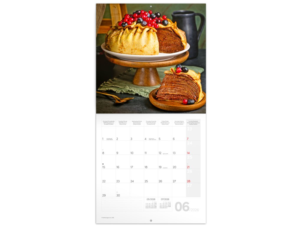Jedinečný kalendář pro všechny milovníky sladkostí! Ochutnejte různé druhy dortů na stránkách tohoto kalendáře. Uvnitř najdete šestijazyčné kalendárium, měsíční fáze, důležité svátky a prostor pro vaše poznámky a plány.Doplňkové parametry