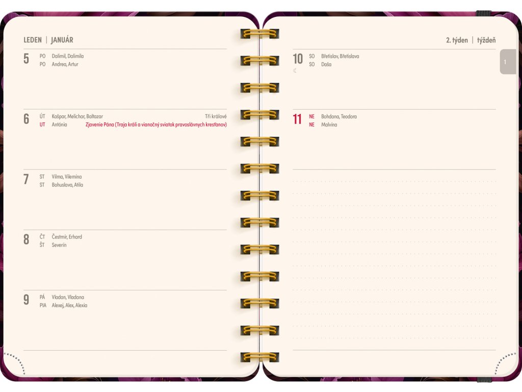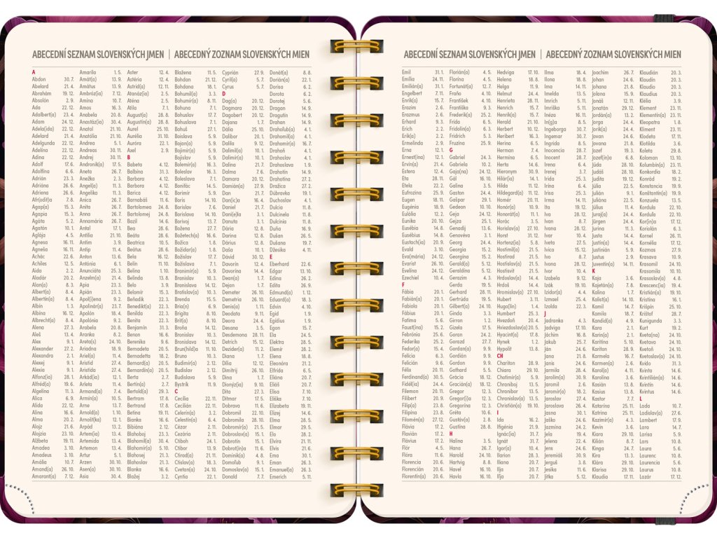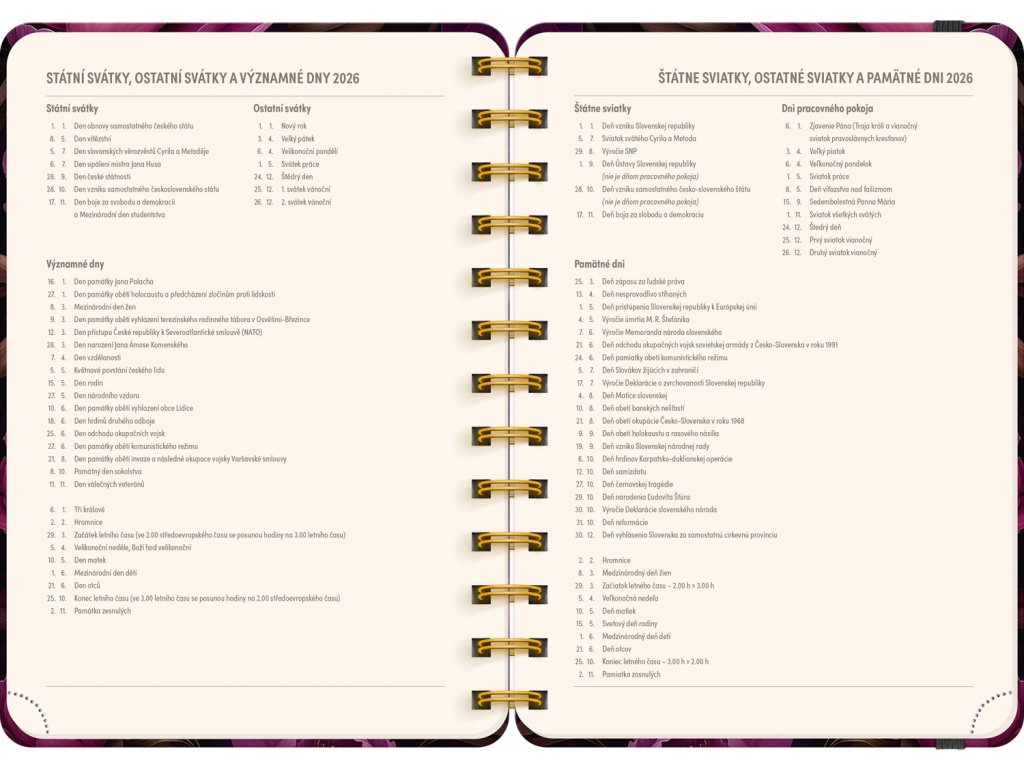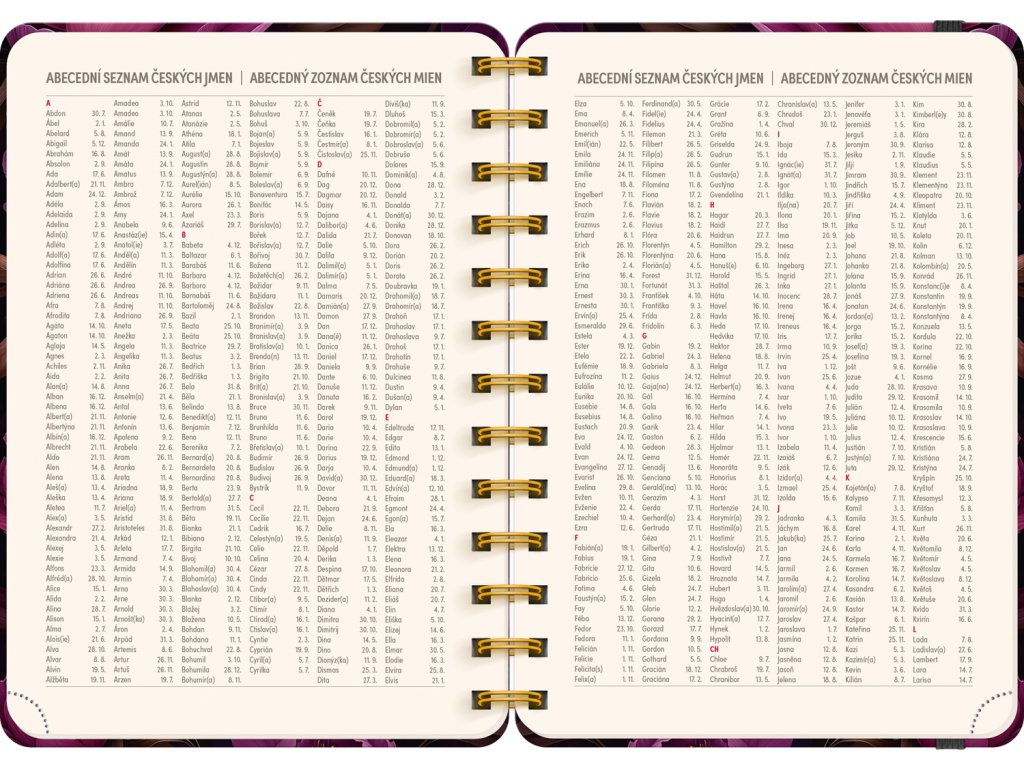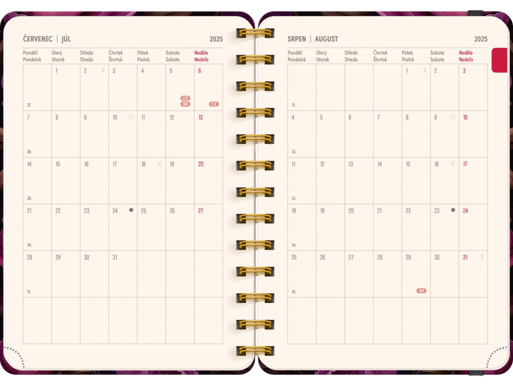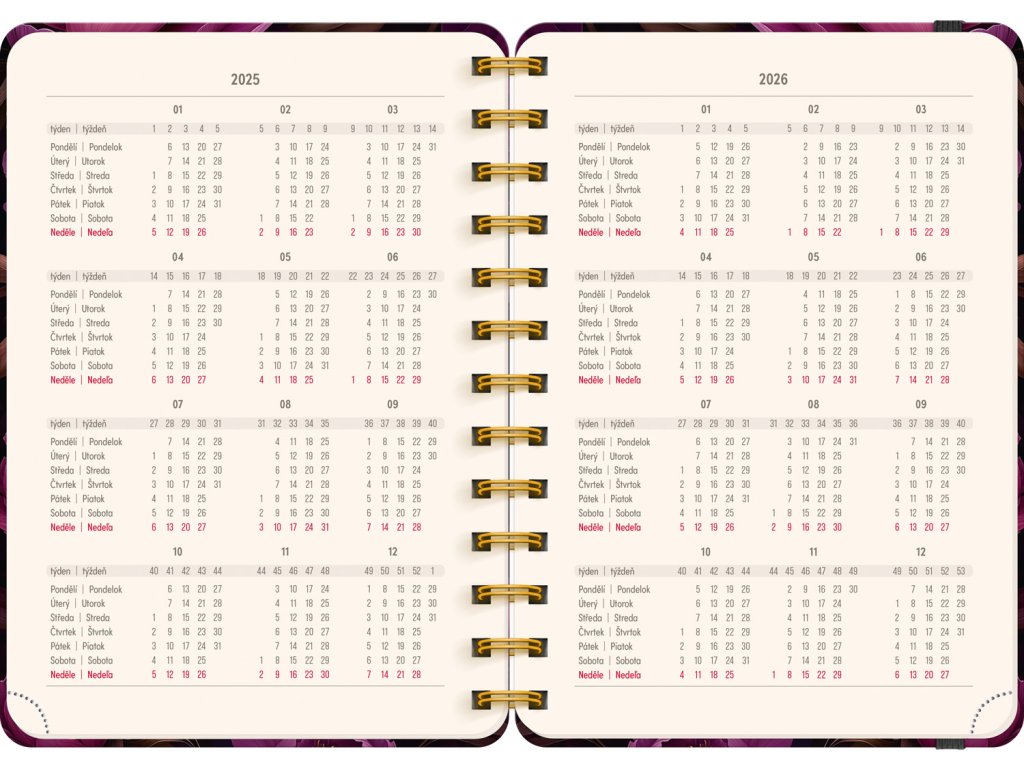Osmnáctiměsíční diář obsahuje přehled na rok 2025 a 2026, seznam českých a slovenských jmen, česko-slovenské týdenní řádkové kalendárium se jmény a svátky a prostor na poznámky. Kalendárium začíná v červenci 2025 a končí v prosinci 2026.Doplňkové parametry