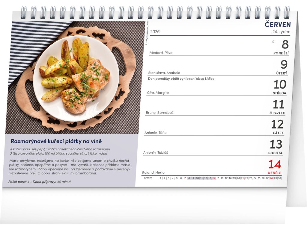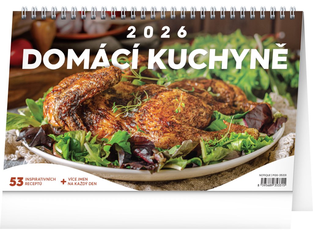 Pro všechny, kteří hledají inspiraci při vymýšlení nových jídel, je tu stolní kalendář nabitý těmi nejzajímavější recepty. Najdete zde 53 receptů, jejichž základem je poctivá domácí kuchyně, kterou vyznávaly už naše babičky. Týdenní stolní kalendář s českými jmény obsahuje také svátky, památné dny, měsíční fáze a přehled na celý rok 2026 a 2027.Doplňkové parametry