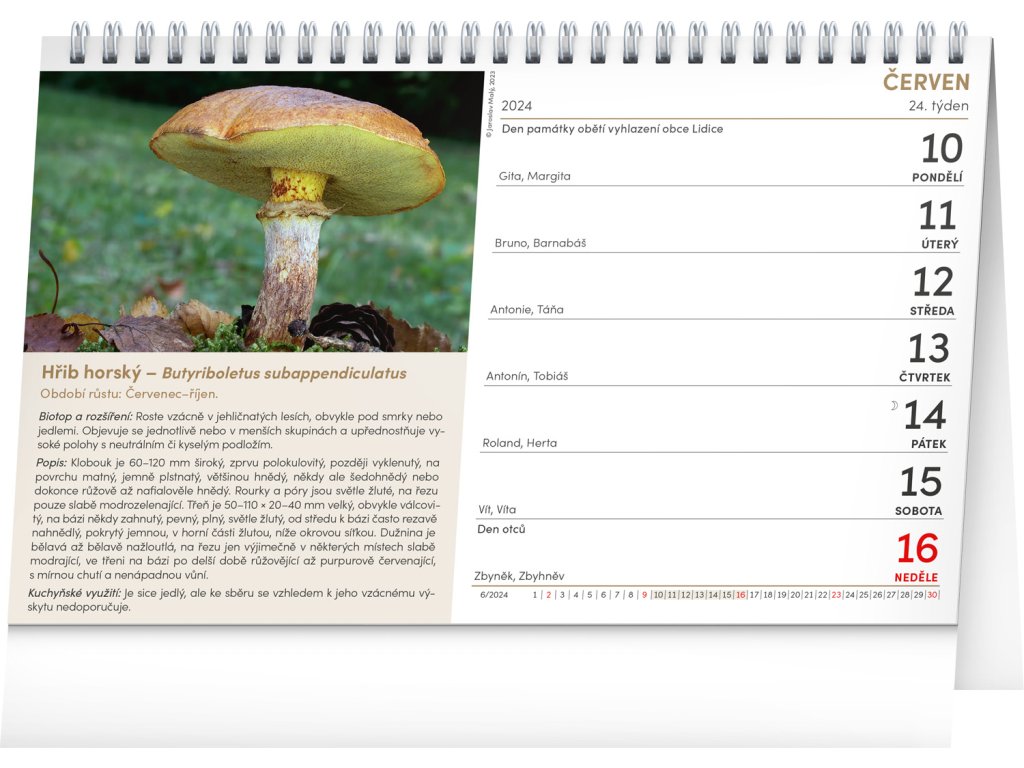 Houbařský kalendář je ideální pro všechny nadšené houbaře. Najdete v něm známé i méně známé druhy hřibovitých hub, popis jejich biotopu, kuchyňské využití a vliv na zdraví. Texty a fotografie připravil odborník a mykolog Jaroslav Malý. Stolní kalendář s českým kalendáriem obsahuje svátky a památné dny, měsíční fáze a přehled na celý rok.Doplňkové parametry