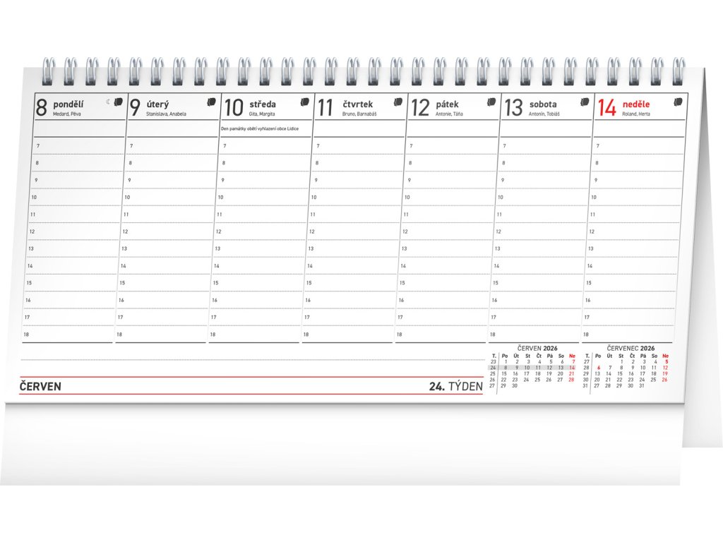 Zapište si do stolního kalendáře se sloupcovým kalendáriem své plány, schůzky a důležitá data. Dostatek místa na poznámky v jednotlivých dnech a přehlednost struktury kalendária doplňují česká jména, svátky a památné dny.Doplňkové parametry