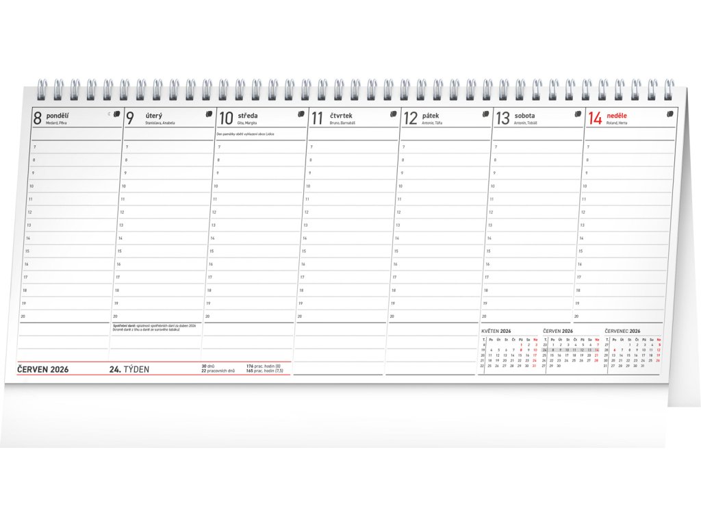 Stolní kalendář se sloupcovým kalendáriem obsahuje všechny termíny daňových povinností, česká jména, svátky a památné dny a tříměsíční přehled u každého týdne. Přehledně si naplánujete svůj čas, u každého dne je dostatek prostru na poznámky.Doplňkové parametry