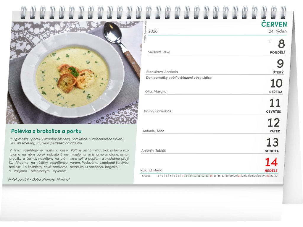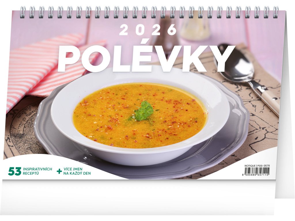 53 receptů na ty nejlahodnější polévky. Ochutnejte každý týden jinou! Týdenní kalendárium s prostorem pro poznámky obsahuje také svátky, památné dny, měsíční fáze a přehled na celý rok 2026 a 2027.Doplňkové parametry