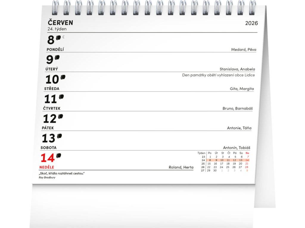 Praktický stolní kalendář v malém formátu obsahuje přehledné týdenní bezobrázkové kalendárium s dostatečným prostorem pro vaše poznámky. Dále v něm najdete citáty na každý týden, znamení zvěrokruhu, česká jména, svátky a památné dny.Doplňkové parametry