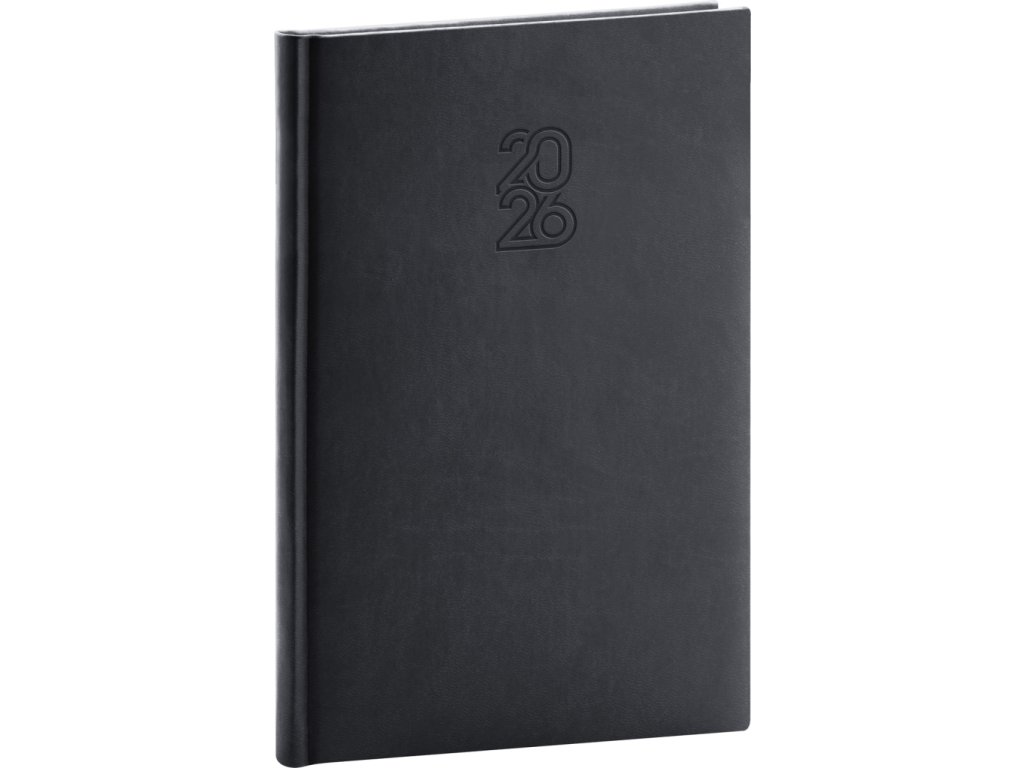 Týdenní diář Aprint 2026 v černé barvě. Kolekce vsadila na osvědčené barvy, které doplňuje nová ražba letopočtu. Týdenní rozvrh s česko-slovenským kalendáriem a doplňkovou angličtinou, němčinou, maďarštinou a ruštinou.• kalendárium od prosince 2025