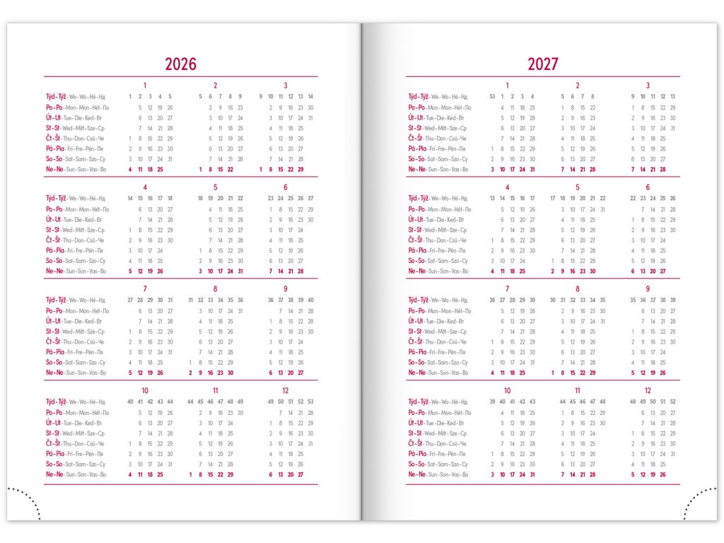 Plánovací týdenní diář Balakon 2026 v zeleném provedení, doplněný o stříbrný letopočet. Povrch diáře si získal oblibu díky kvalitnímu svrchnímu materiálu, který je extrémně odolný vůči vnějšímu poškození. Týdenní rozvrh s česko-slovenským kalendáriem a doplňkovou angličtinou, němčinou, maďarštinou a ruštinou.• kalendárium od prosince 2025