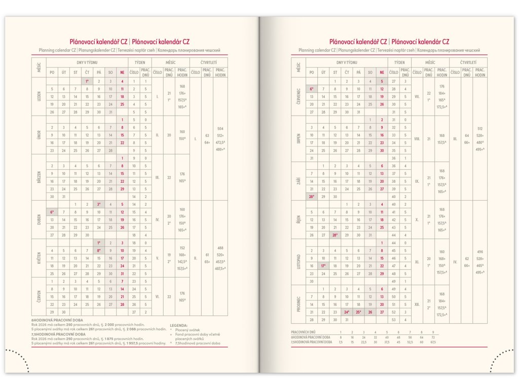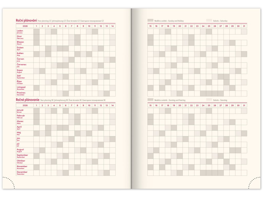 Nová řada diářů v moderním designu doplněném o pevnou gumičku a poutko na pero. Týdenní rozložení s česko-slovenským kalendáriem a doplňkovou angličtinou, němčinou, maďarštinou a ruštinou.• kalendárium od prosince 2025