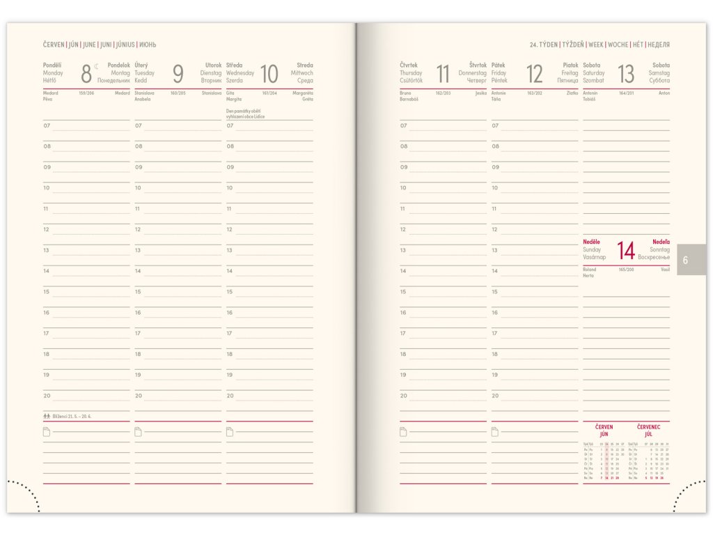 Nová řada diářů v moderním designu doplněném o pevnou gumičku a poutko na pero. Týdenní rozložení s česko-slovenským kalendáriem a doplňkovou angličtinou, němčinou, maďarštinou a ruštinou.• kalendárium od prosince 2025
