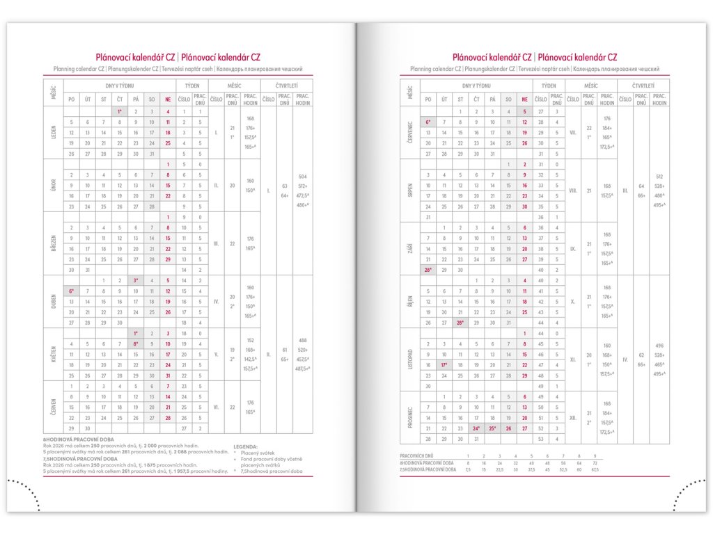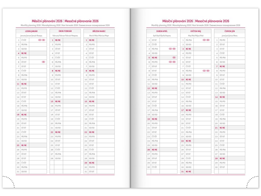 Týdenní diář Tomy 2026 v hnědo-červené barvě. Klasický povrch imitující kůži, který doplňuje jemné prošití. Na materiál lze tisknout a je vhodný pro všechny typy ražeb. Týdenní rozvrh s česko-slovenským kalendáriem a doplňkovou angličtinou, němčinou, maďarštinou a ruštinou.• kalendárium od prosince 2025
