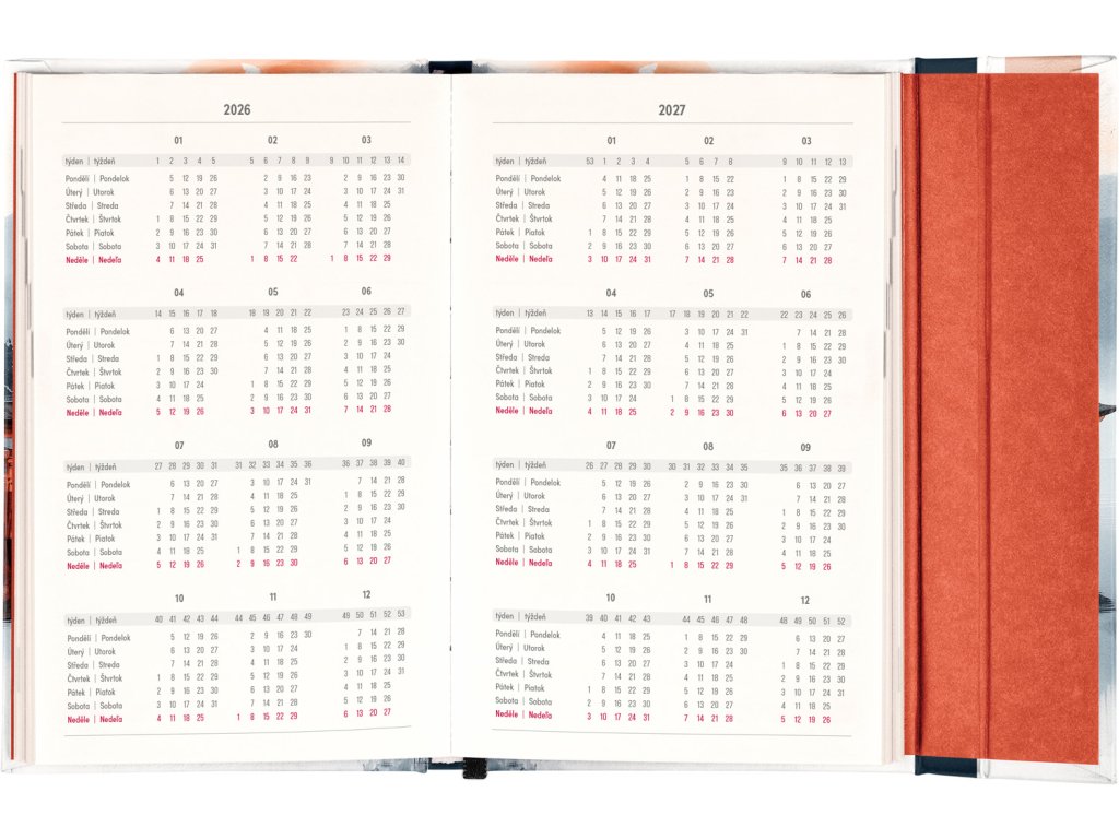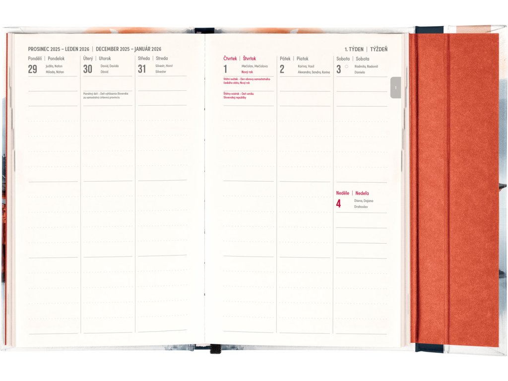 Týdenní diář s praktickým magnetickým uzavíráním je ideální volbou pro ty, kteří chtějí mít své plány přehledně pod kontrolou. Nabízí sloupcové rozvržení jednotlivých týdnů s dostatkem prostoru pro každodenní poznámky. Součástí jsou praktické měsíční přehledy, ideální pro plánování dovolených či prázdnin, a také seznam českých a slovenských svátků a jmenin.Doplňkové parametry