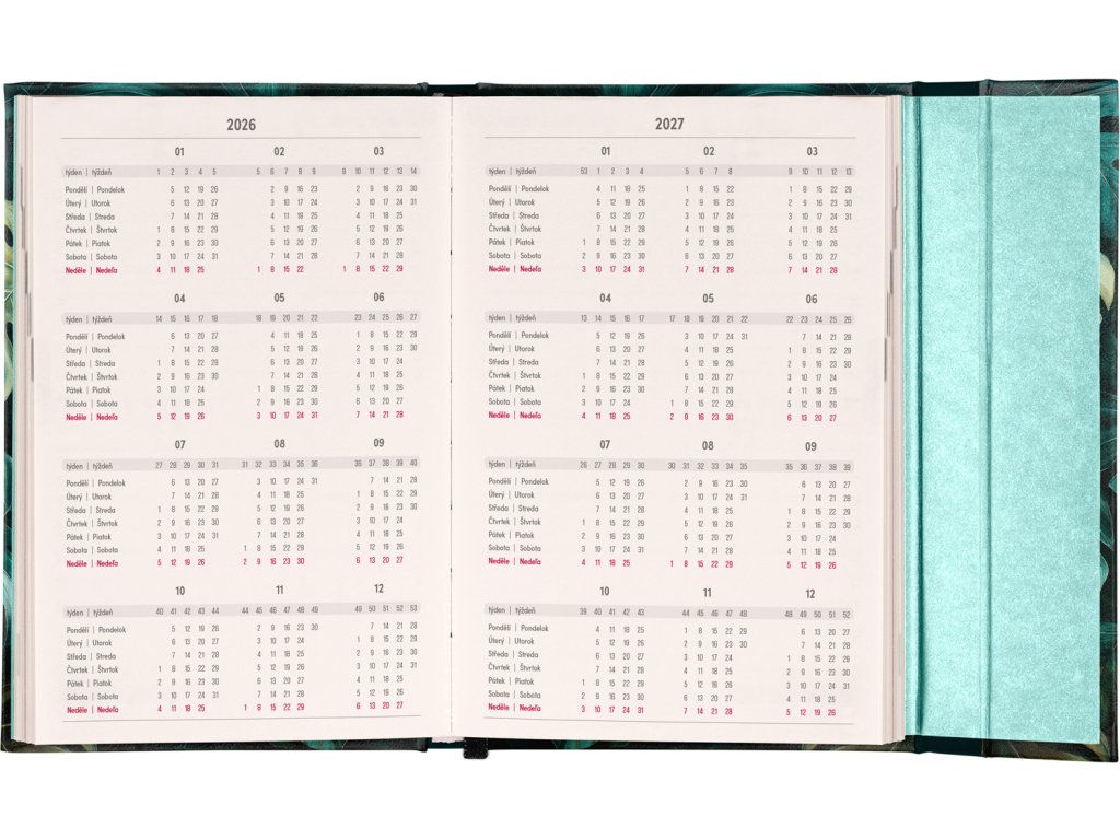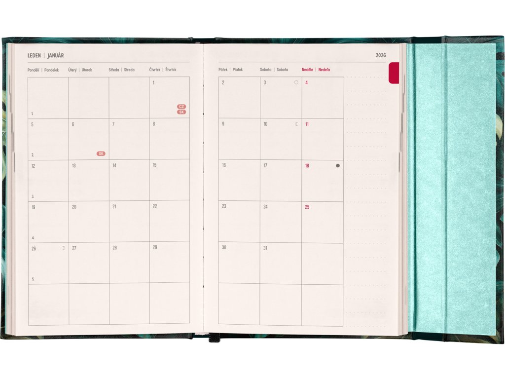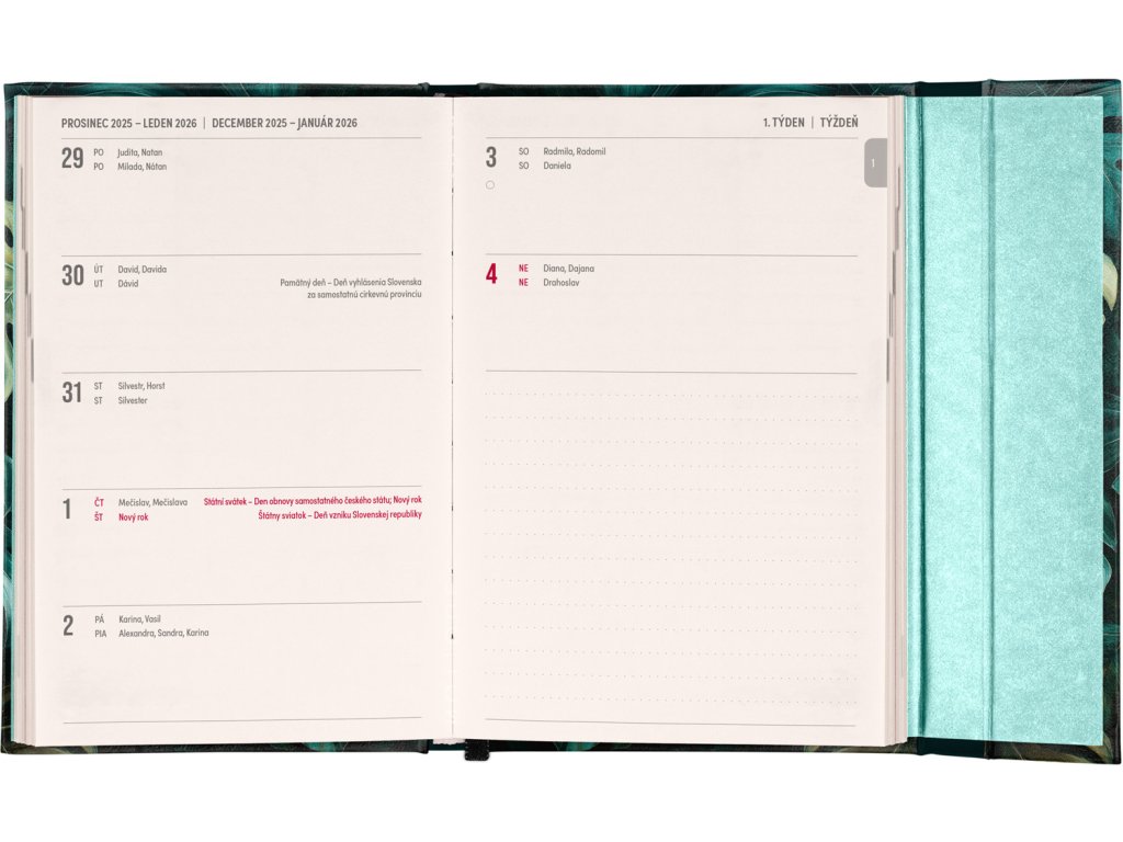 Týdenní diář s praktickým magnetickým uzavíráním je ideální volbou pro ty, kteří chtějí mít své plány přehledně pod kontrolou. Horizontální rozložení s českým a slovenským kalendáriem ve verzi týden na dvou stranách s prostorem pro poznámky. Součástí jsou praktické měsíční přehledy, ideální pro plánování dovolených či prázdnin, a také seznam českých a slovenských svátků a jmenin.Doplňkové parametry