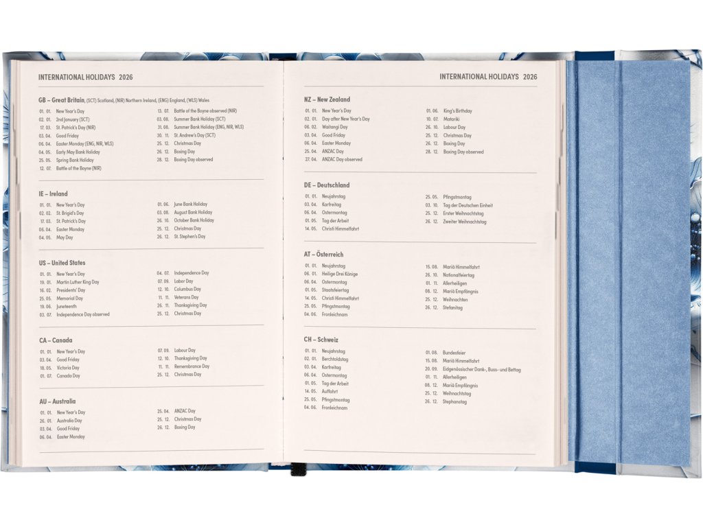 Týdenní diář v anglickém jazyce s mezinárodními svátky a praktickým magnetickým uzavíráním je ideální volbou pro ty, kteří chtějí mít své plány přehledně pod kontrolou. Nabízí horizontální rozložení ve verzi týden na dvou stranách s prostorem pro poznámky. Součástí jsou praktické měsíční přehledy, ideální pro plánování dovolených či prázdnin.Doplňkové parametry