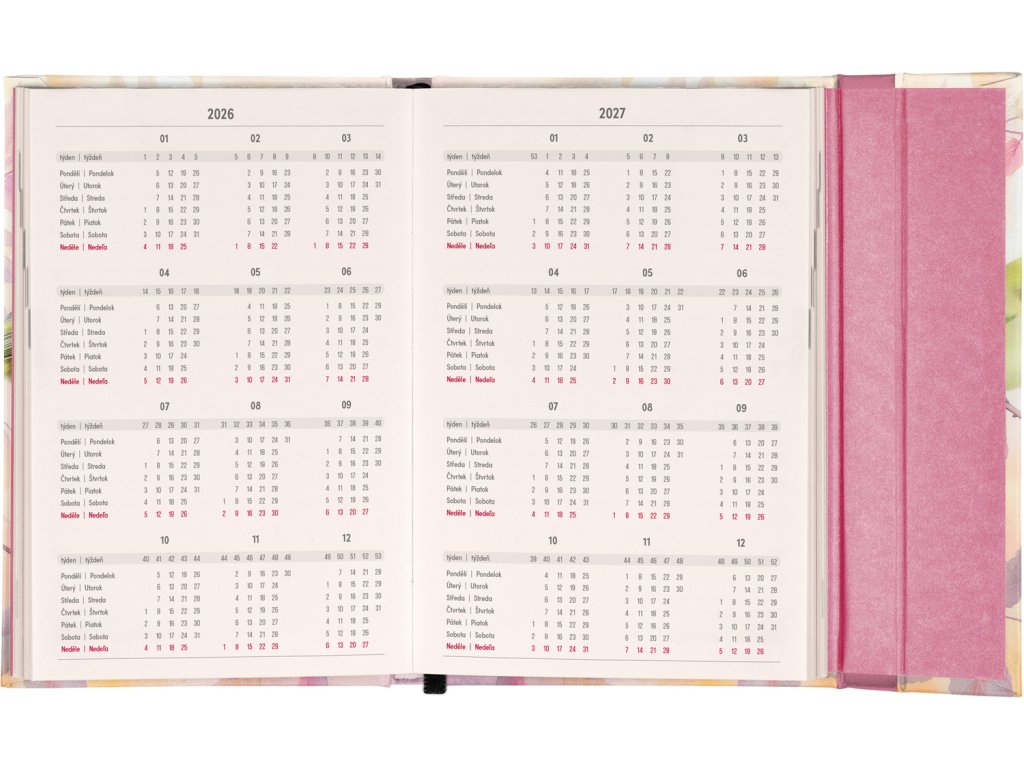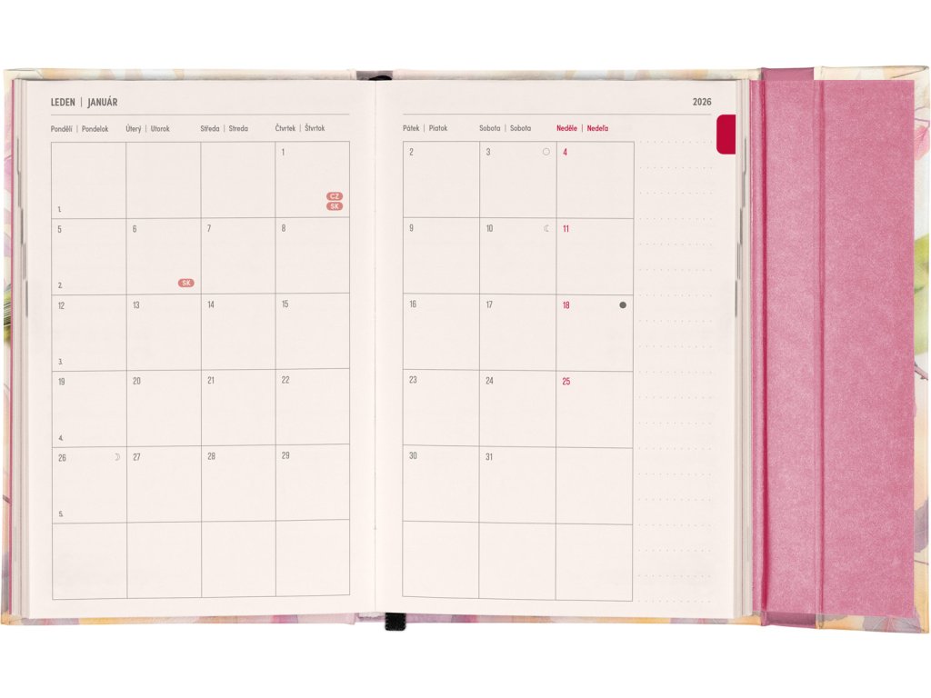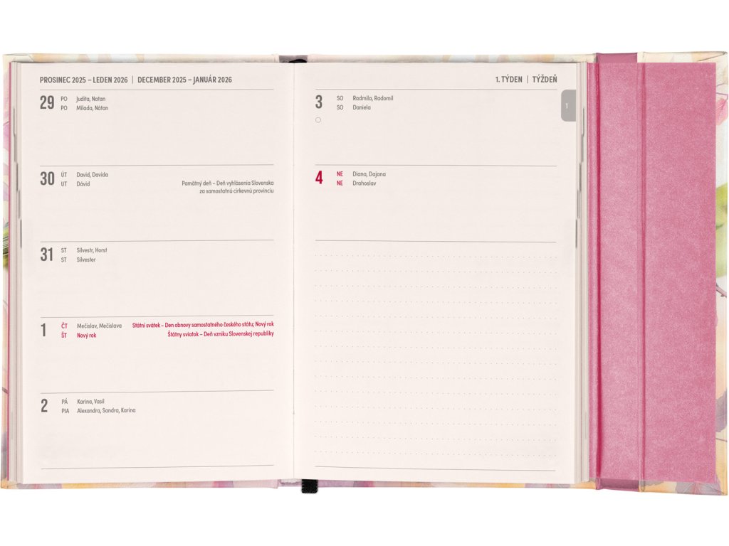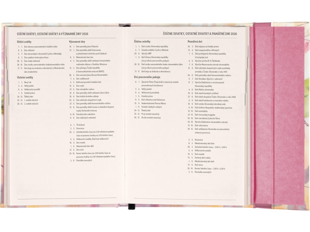 Týdenní diář s praktickým magnetickým uzavíráním je ideální volbou pro ty, kteří chtějí mít své plány přehledně pod kontrolou. Horizontální rozložení s českým a slovenským kalendáriem ve verzi týden na dvou stranách s prostorem pro poznámky. Součástí jsou praktické měsíční přehledy, ideální pro plánování dovolených či prázdnin, a také seznam českých a slovenských svátků a jmenin.Doplňkové parametry