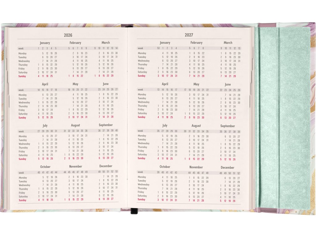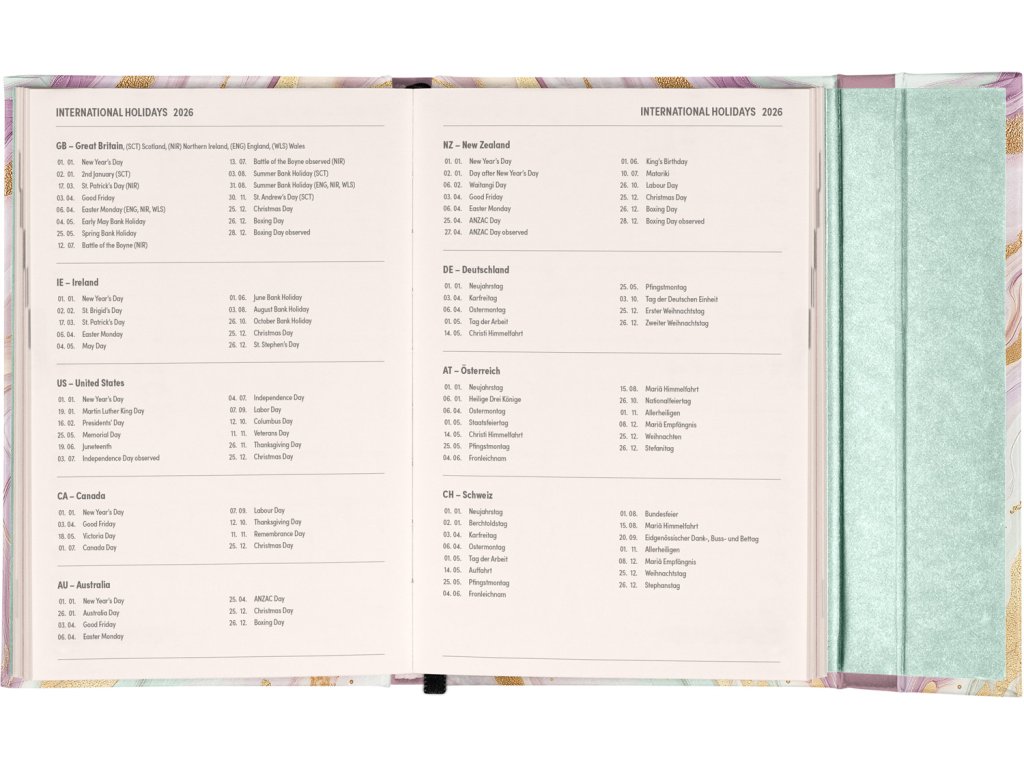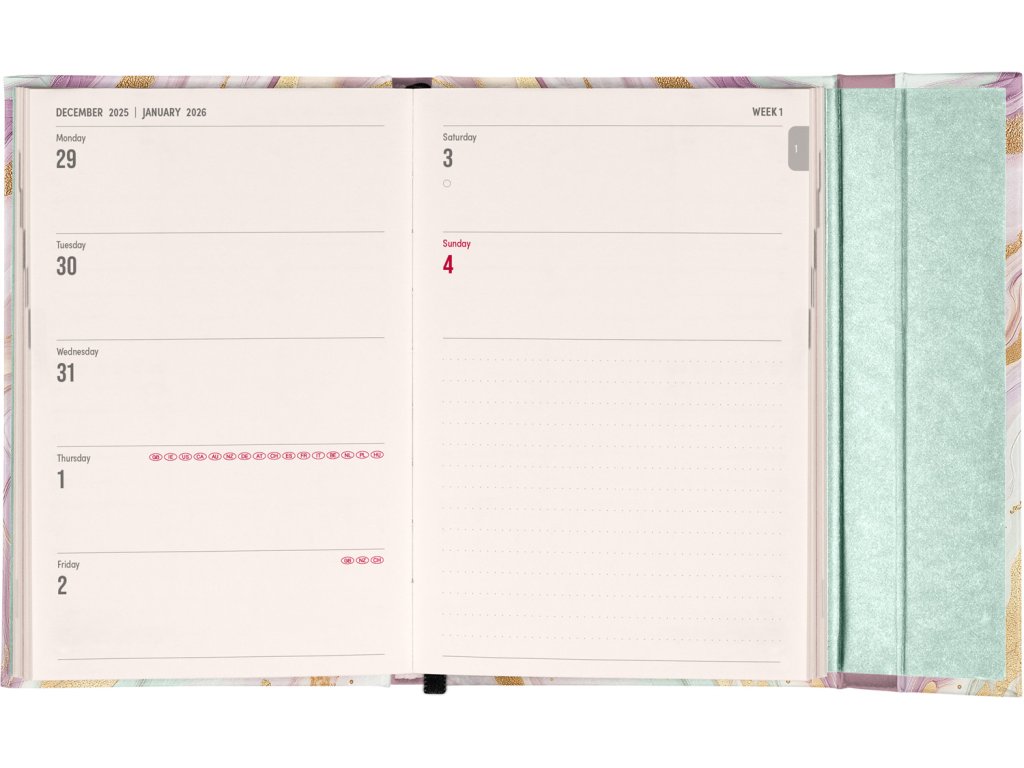 Týdenní diář v anglickém jazyce s mezinárodními svátky a praktickým magnetickým uzavíráním je ideální volbou pro ty, kteří chtějí mít své plány přehledně pod kontrolou. Nabízí horizontální rozložení ve verzi týden na dvou stranách s prostorem pro poznámky. Součástí jsou praktické měsíční přehledy, ideální pro plánování dovolených či prázdnin.Doplňkové parametry
