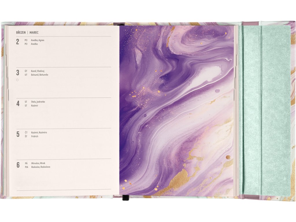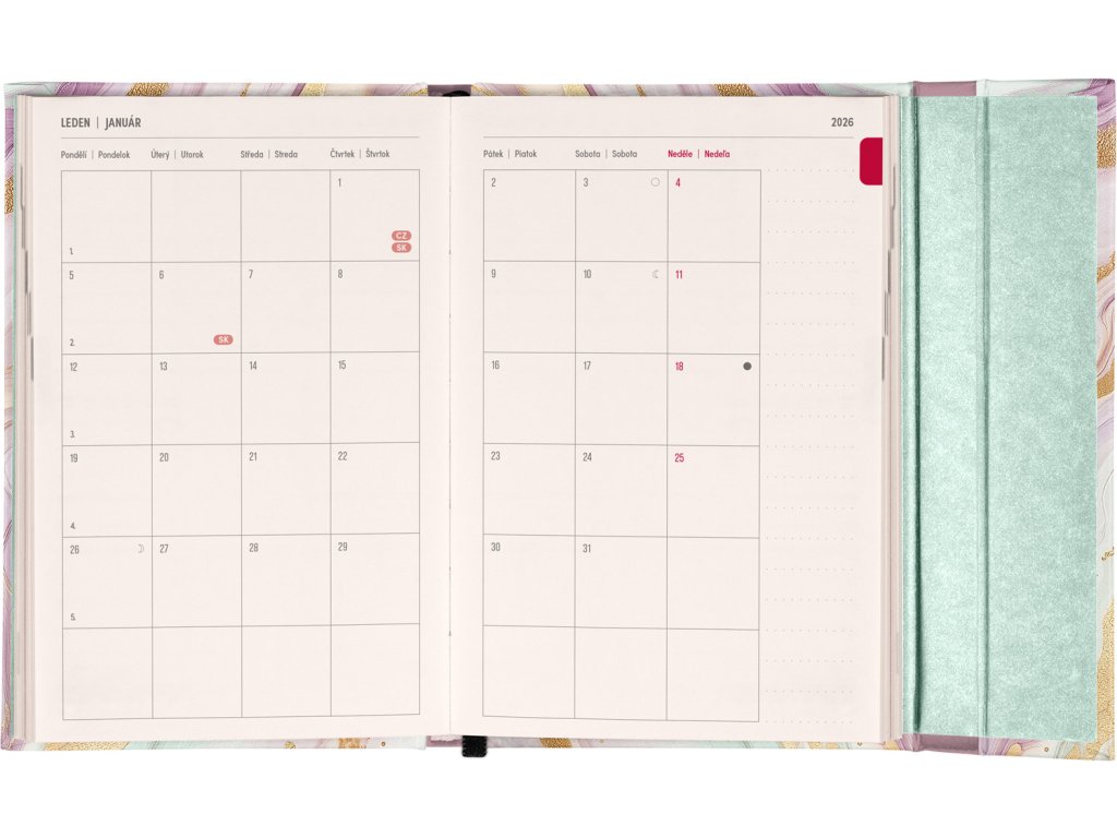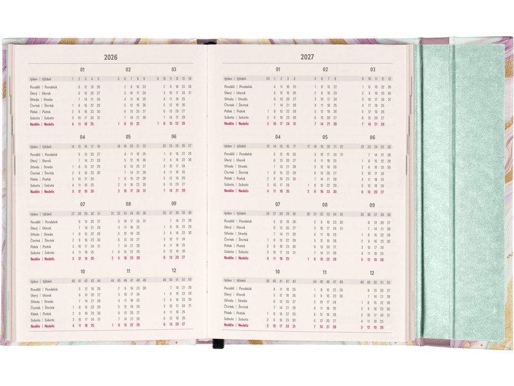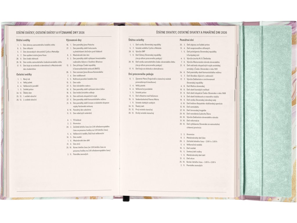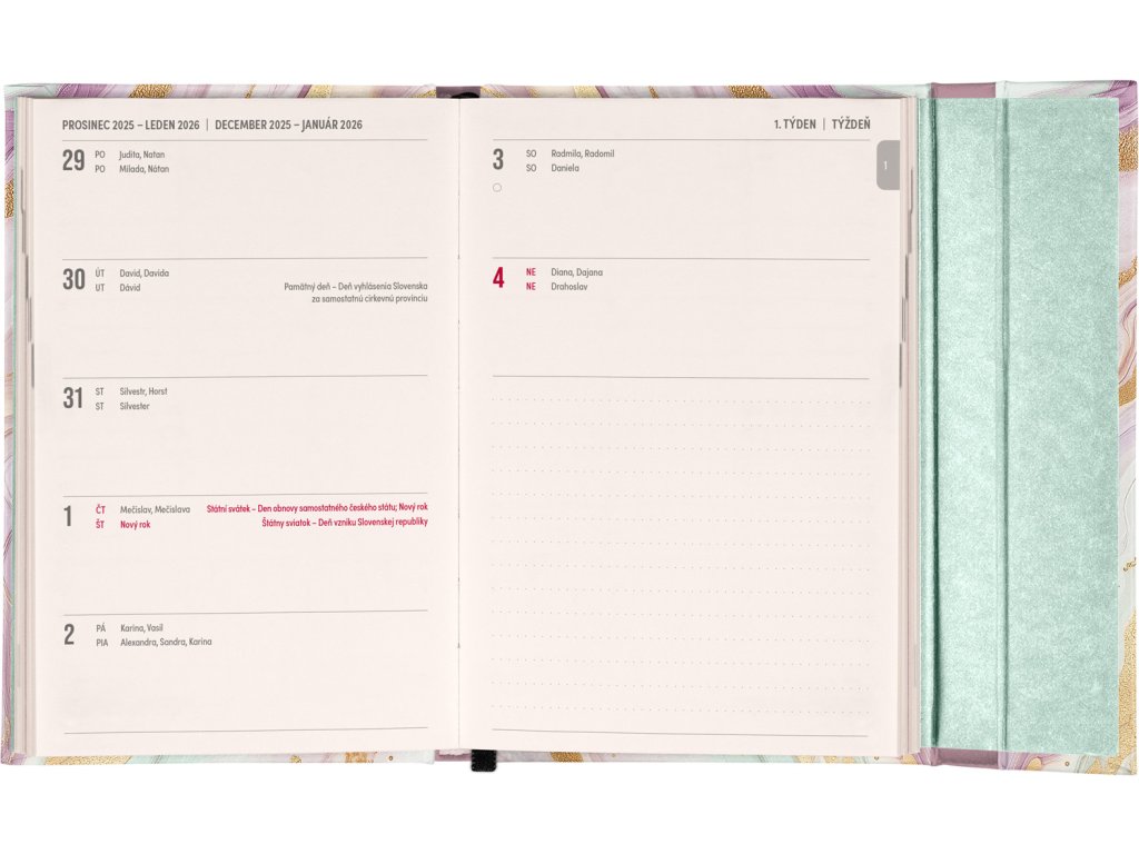 Týdenní diář s praktickým magnetickým uzavíráním je ideální volbou pro ty, kteří chtějí mít své plány přehledně pod kontrolou. Horizontální rozložení s českým a slovenským kalendáriem ve verzi týden na dvou stranách s prostorem pro poznámky. Součástí jsou praktické měsíční přehledy, ideální pro plánování dovolených či prázdnin, a také seznam českých a slovenských svátků a jmenin.Doplňkové parametry