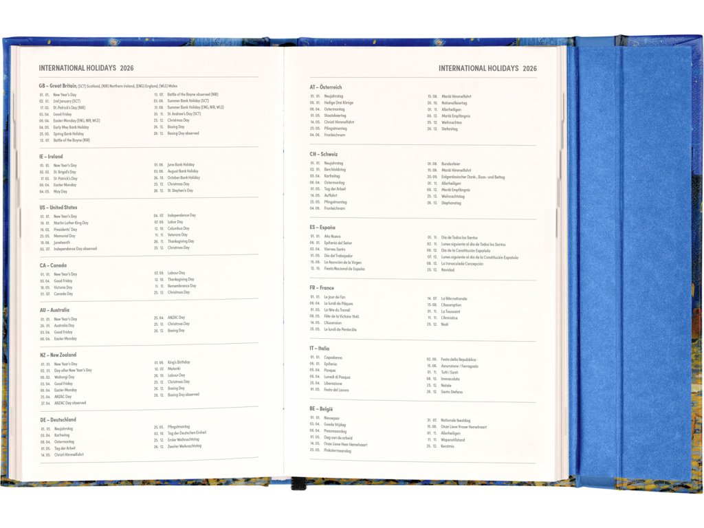 Týdenní diář v anglickém jazyce s mezinárodními svátky a praktickým magnetickým uzavíráním je ideální volbou pro ty, kteří chtějí mít své plány přehledně pod kontrolou. Nabízí sloupcové rozvržení jednotlivých týdnů s dostatkem prostoru pro každodenní poznámky. Součástí jsou praktické měsíční přehledy, ideální pro plánování dovolených či prázdnin.Doplňkové parametry