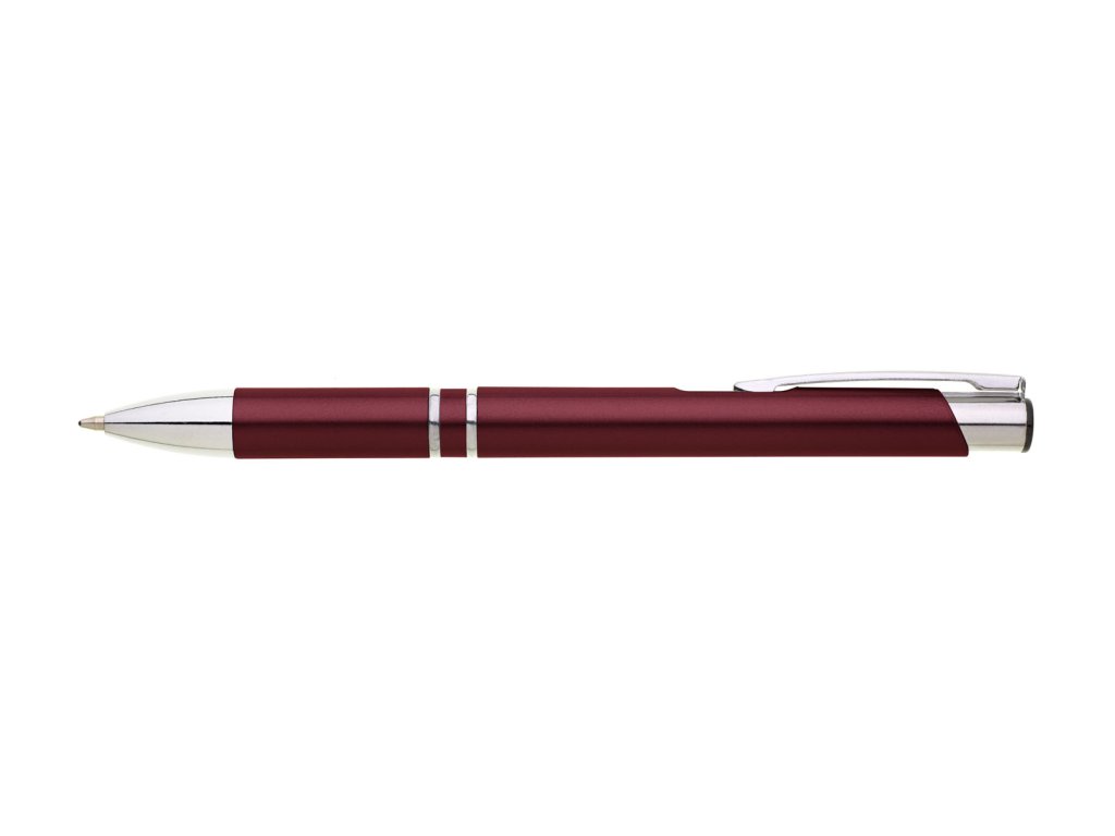 Plastové propisovací pero OIRA - bordó. Pero je zdobené dvěma stříbrnými proužky. Na těle je zdobeno oválným výřezem. Pero má náplň velkoobsahovou, modře píšící.Doplňkové parametry