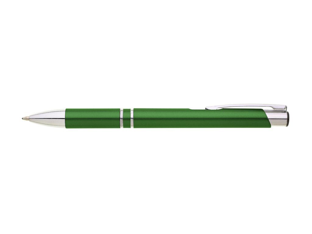 Plastové propisovací pero OIRA - zelené. Pero je zdobené dvěma stříbrnými proužky. Na těle je zdobeno oválným výřezem. Pero má náplň velkoobsahovou, modře píšící.Doplňkové parametry