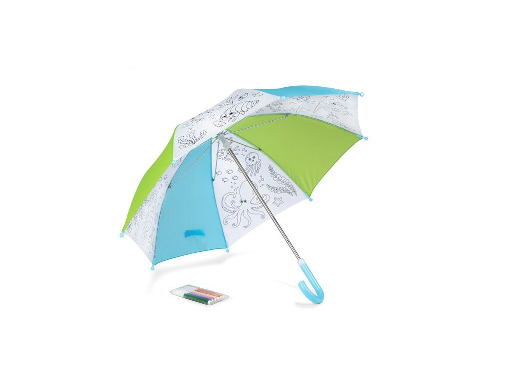 KIDDI je deštník pro děti, který byl vyzdoben mořskými vzory navrženými grafiky Blue Collection. Sada obsahuje 6 fix k samostatnému vybarvení batohu. Manuální deštník je vyroben z polyesteru.Fixy jsou vodotěsné.Doplňkové parametry