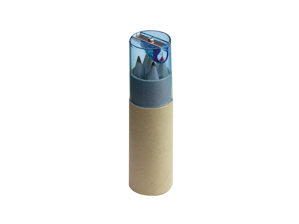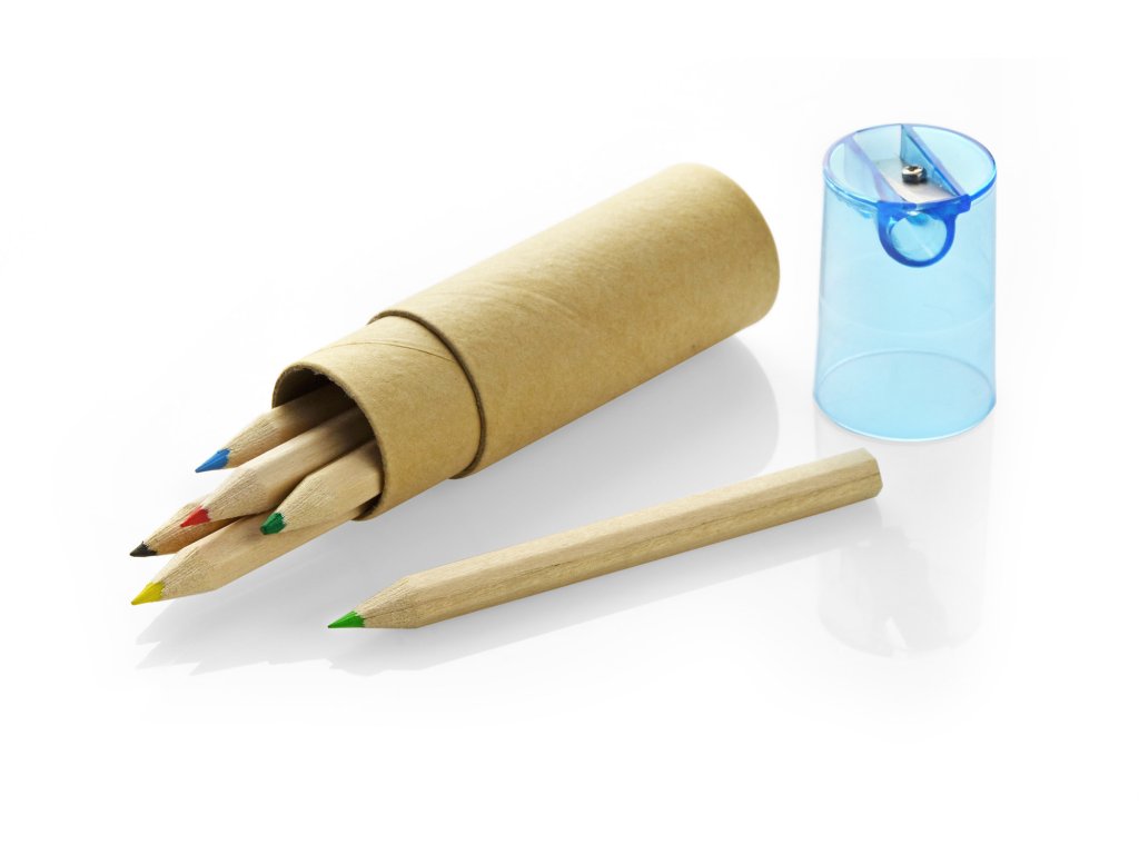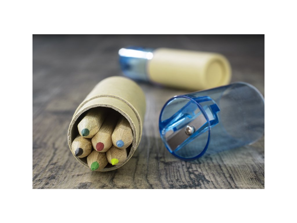 Dřevěné 6-barevné tužky. Balené do papírové trubky s plastovým uzávěrem. V tomto uzávěru je umístěn ořezávač. Logo může být vyraženo na trubce.Doplňkové parametry