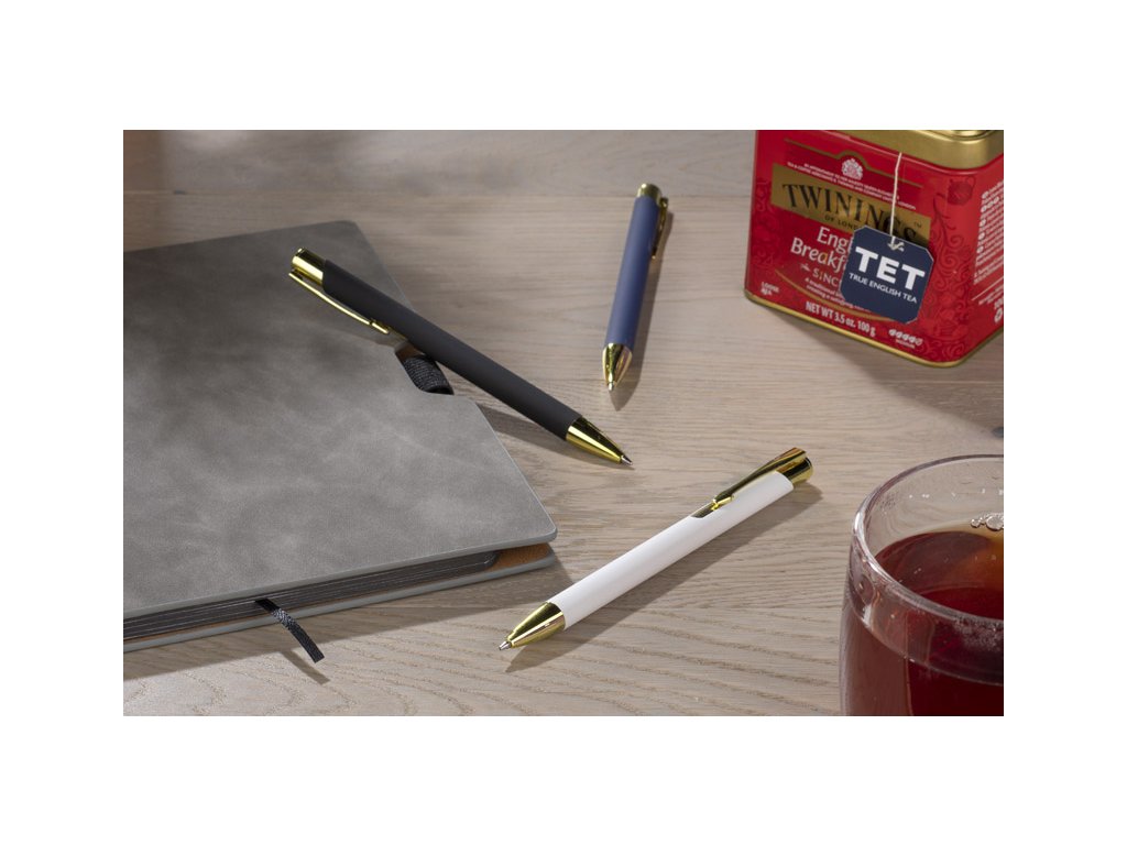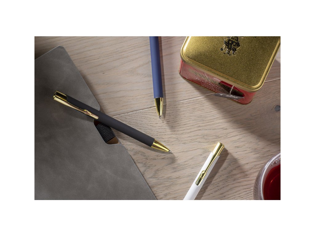 GOLDEN je pero, které se vyznačuje na dotek příjemným gumovým povrchem a mimořádně elegantní zlatou povrchovou úpravou. Tělo je vyrobeno z hliníku. Možnost gravírování loga ve zlatě, které dokonale ladí s povrchovou úpravou pera. Automatické pero. Modrá náplň G2.Doplňkové parametry