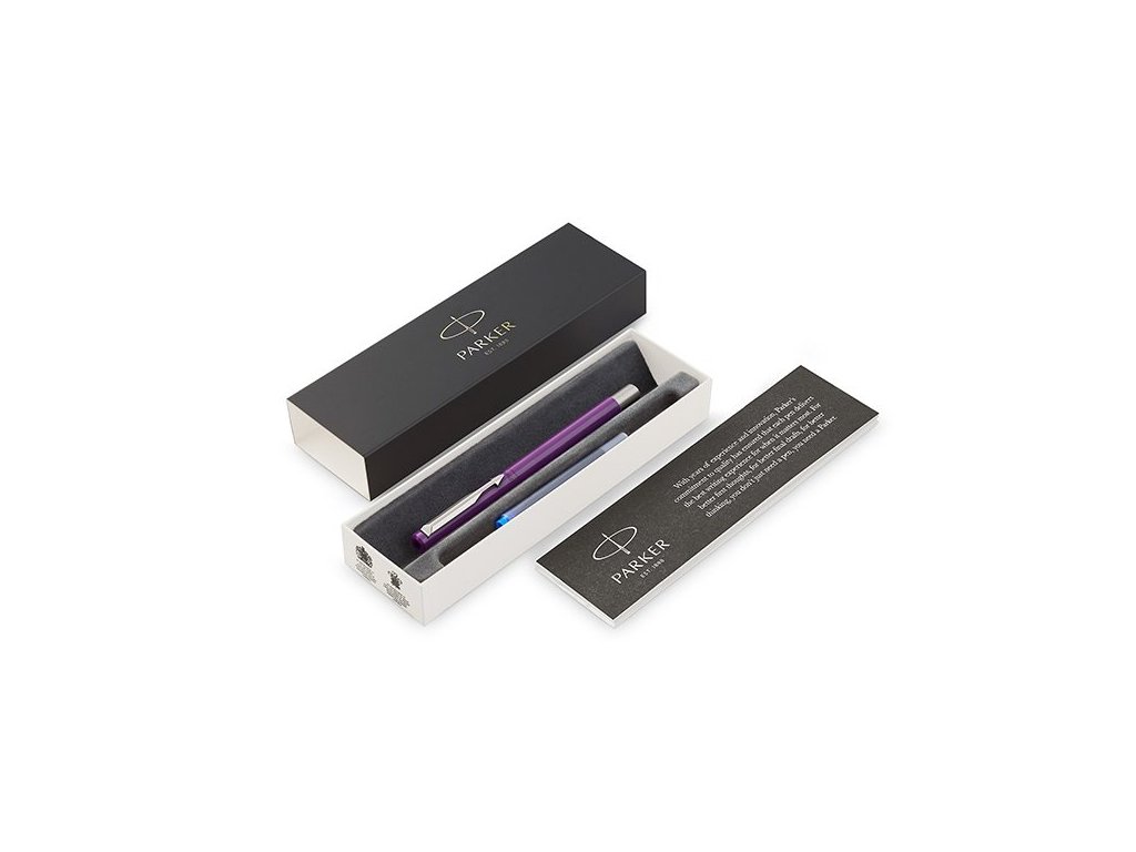 Značkové plnící pero PARKER Royal Vector Purple má tělo i nasazovací víčko z tvrzeného nachového plastu, doplňky, úchopová část a hrot jsou z nerezové oceli. Dvoukanálový systém zásobování hrotu inkoustem, výhradně pro použití s bombičkami Quink nebo konvertorem (není součástí balení). Vector je psacím nástrojem, kterému lze beze zbytku důvěřovat.Doplňkové parametry