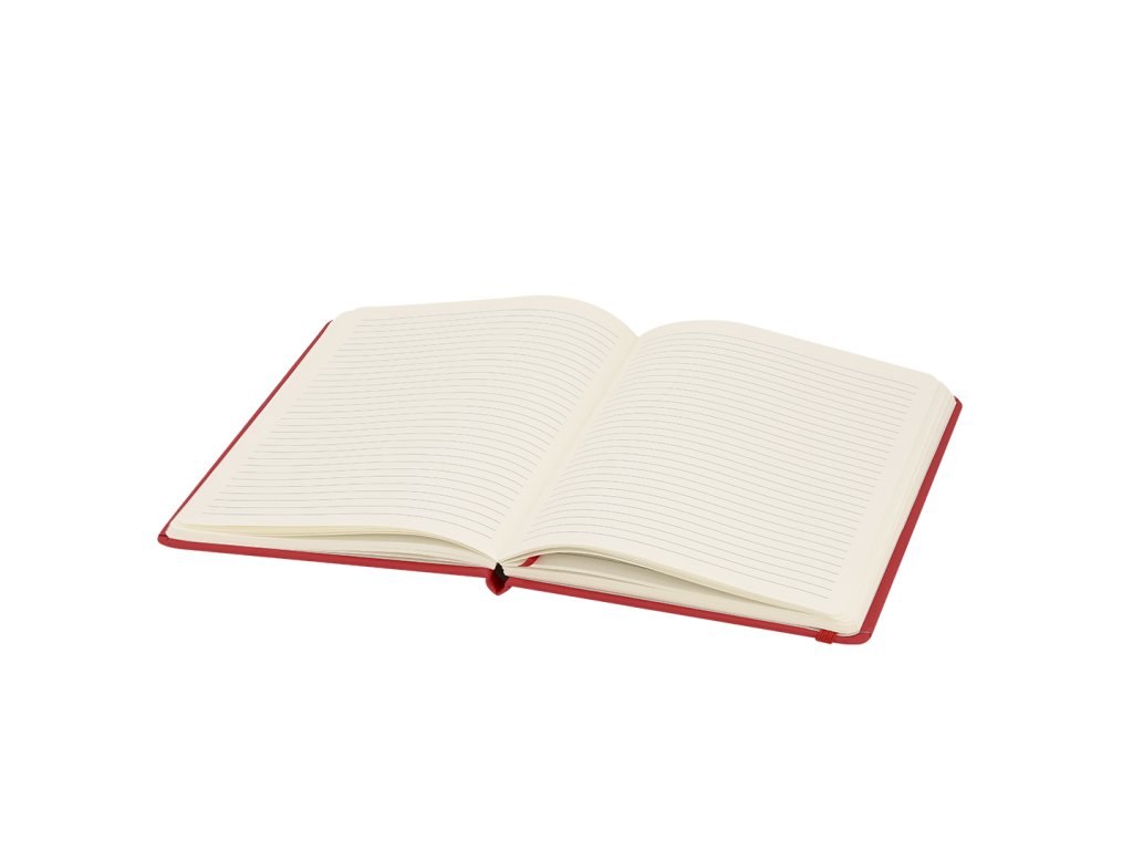Poznámkový blok A5 s tvrdými deskami z měkkého PU, 100 linkovaných listů. Včetně látkové záložky a odpovídající gumičky. K dispozici v různých barvách.