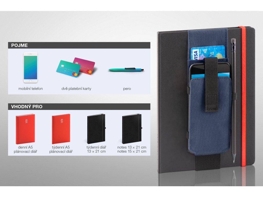 Praktický návlek na diář, který má prostor na dvě kreditní karty, mobilní telefon a uchýt na pero.Doplňkové parametry