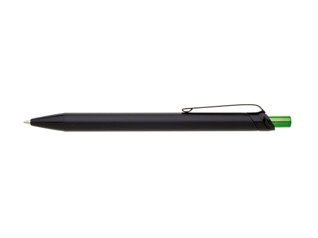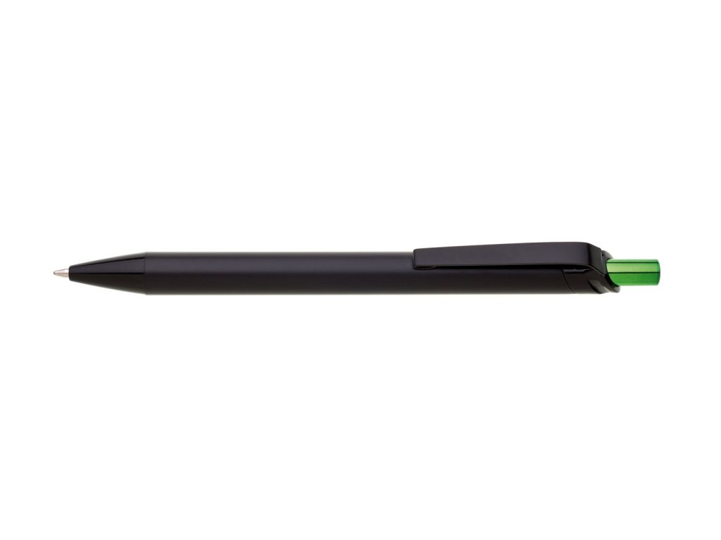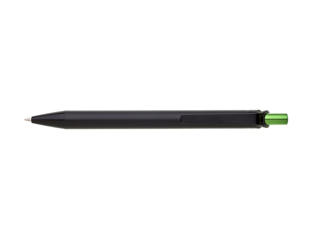 Kovová černá propiska s metalicky zeleným cvakátkem. Netradiční na této propisce je laser, který je zeleně lesklý. Vyniká zde zejména inverzní zpracování loga. Náplň velkoobsahová, modře píšící.Doplňkové parametry
