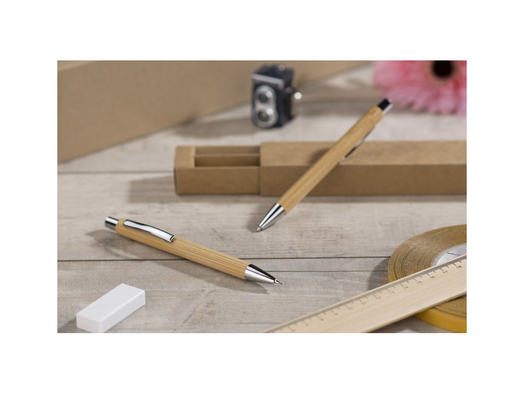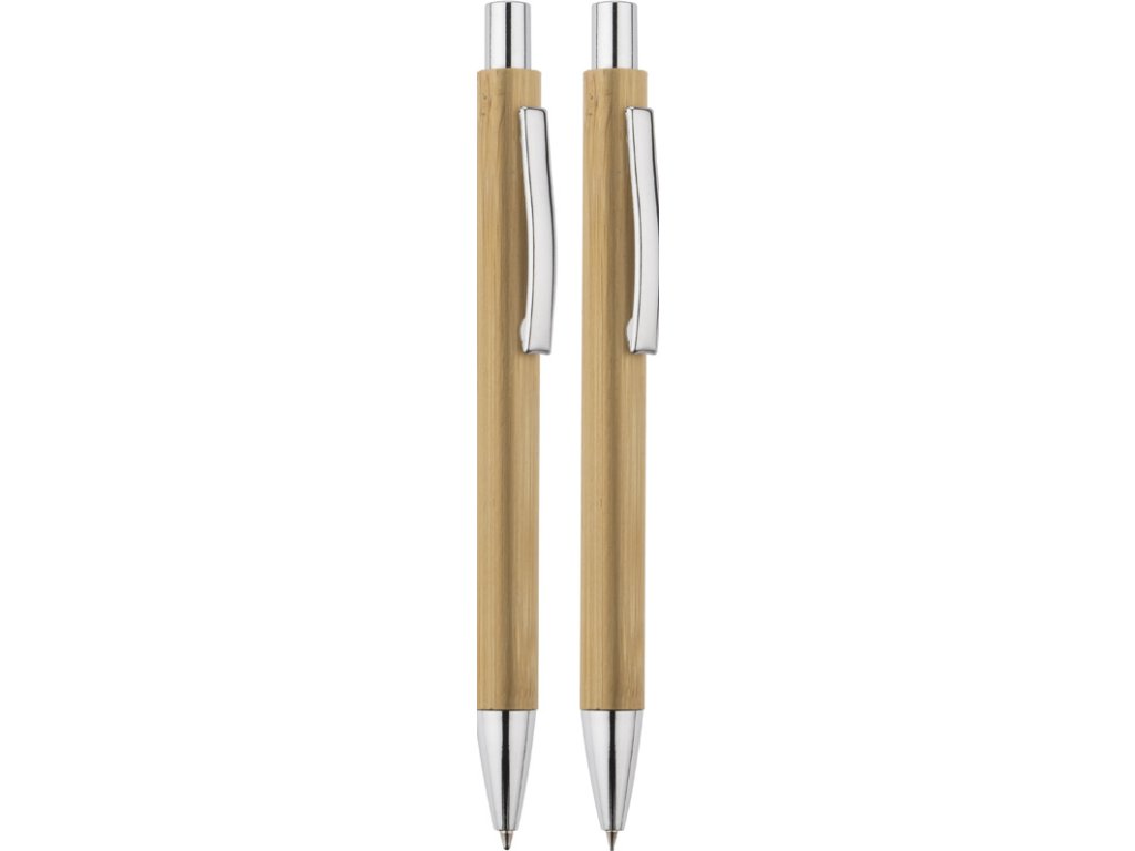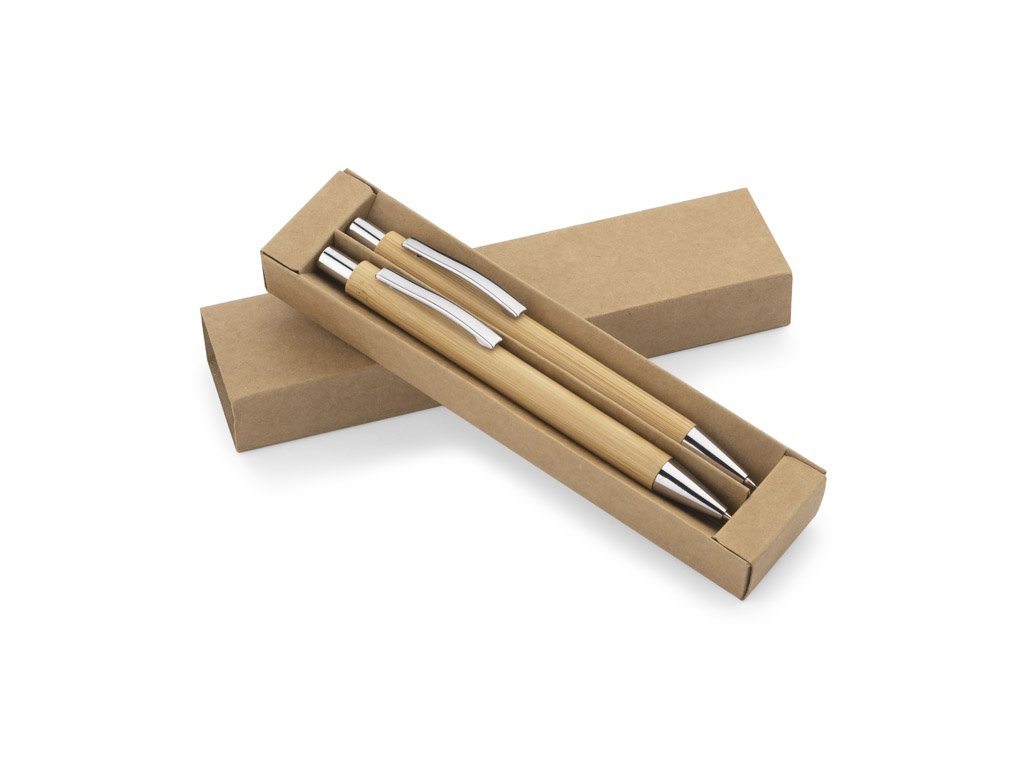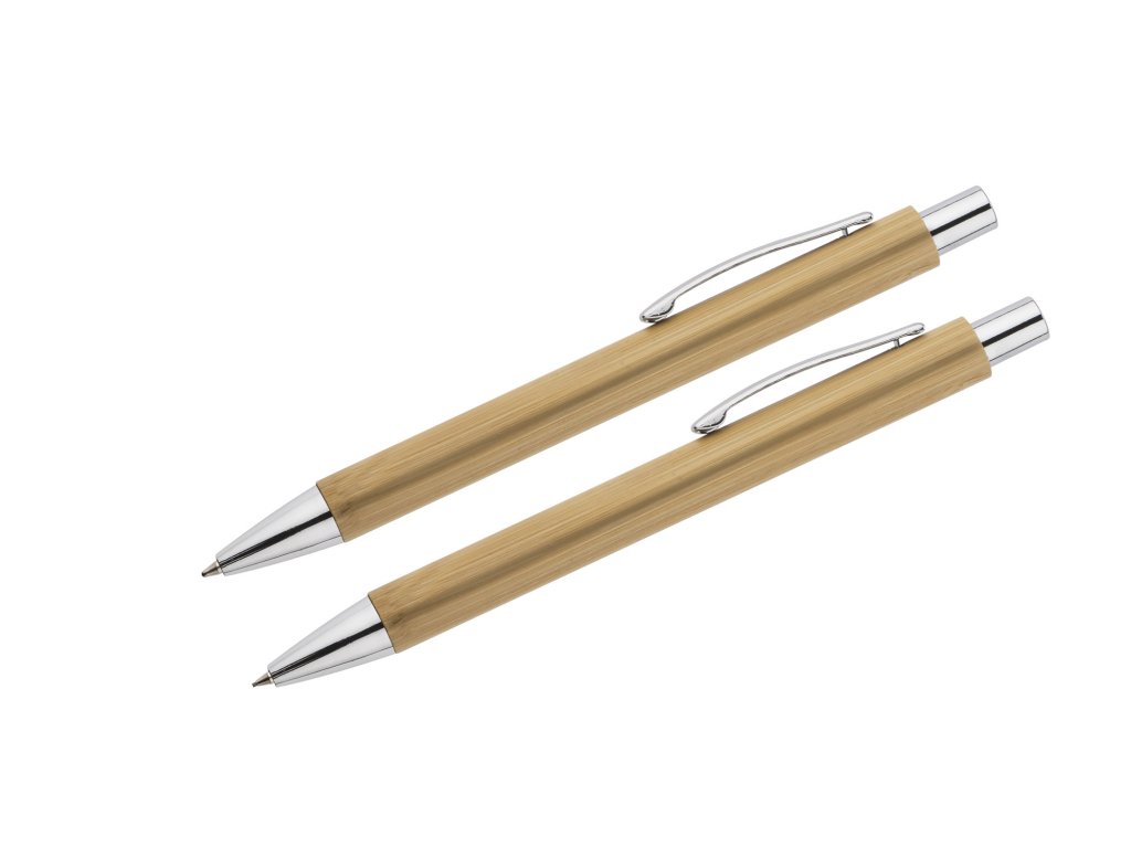 Psací sada MAMBOO se skládá z pera a automatické tužky, zabalené v hnědé ekologické krabici. Tělo pera i tužky je vyrobeno z přírodního bambusu. Chromová úprava dává eleganci. Náplň z modrého pera, mechanická tužka tl.Doplňkové parametry