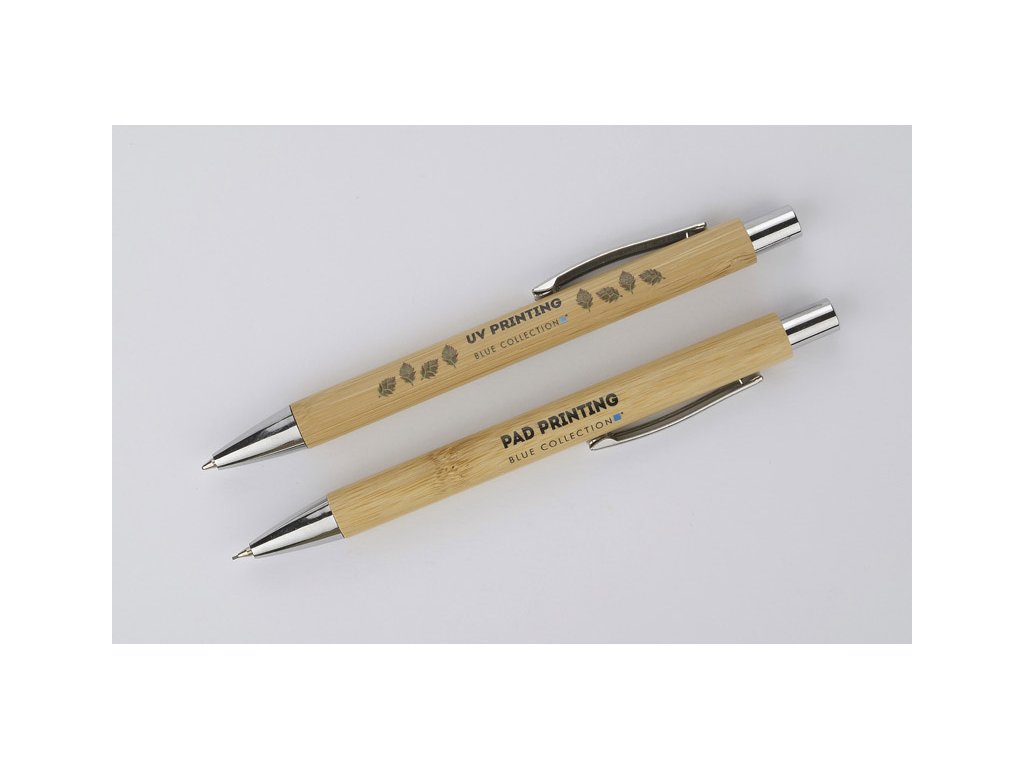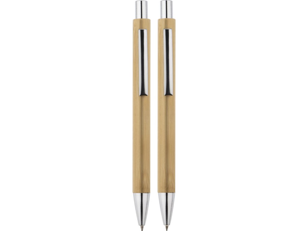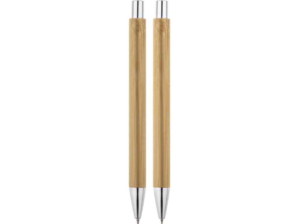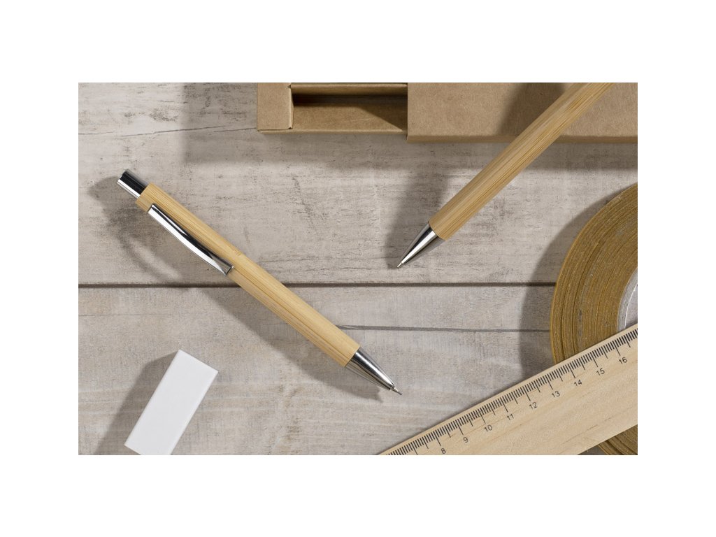 Psací sada MAMBOO se skládá z pera a automatické tužky, zabalené v hnědé ekologické krabici. Tělo pera i tužky je vyrobeno z přírodního bambusu. Chromová úprava dává eleganci. Náplň z modrého pera, mechanická tužka tl.Doplňkové parametry